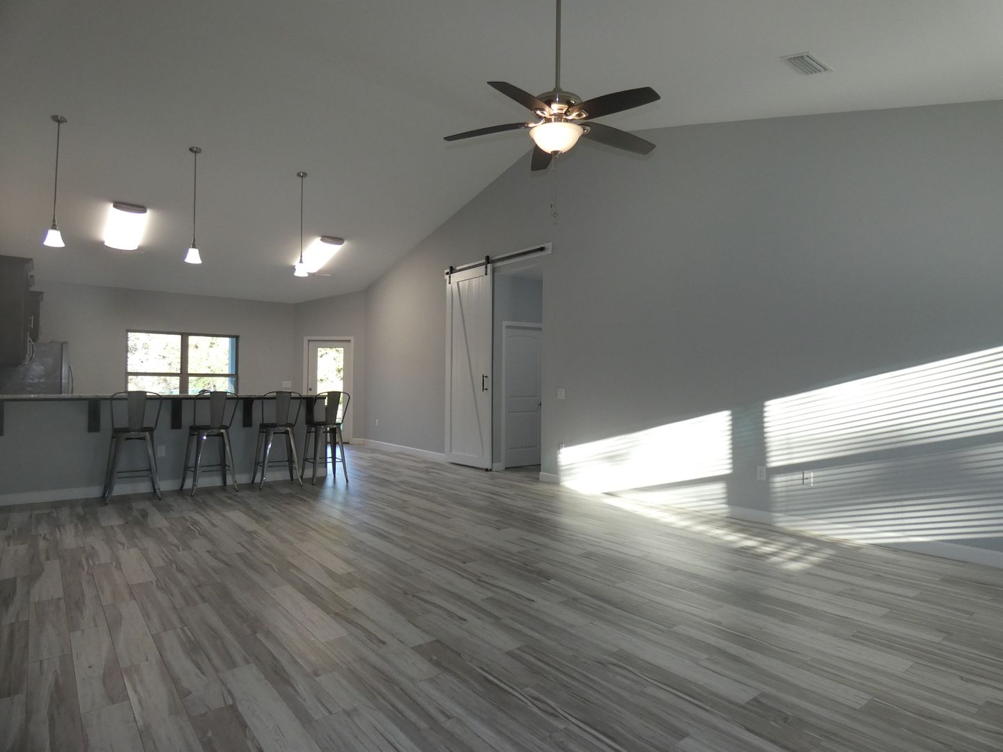 This open-concept home features luxury vinyl plank flooring in the main living areas and carpet in the bedrooms. The great room boasts cathedral ceilings, creating a bright and airy living space, while the beautiful kitchen showcases farmhouse-style finishes, granite countertops, ample dark wood cabinetry, a hop-up bar, dual-basin undermount sink, and stainless steel appliances including a French door refrigerator, flat-top range/oven, built-in microwave, and dishwasher.