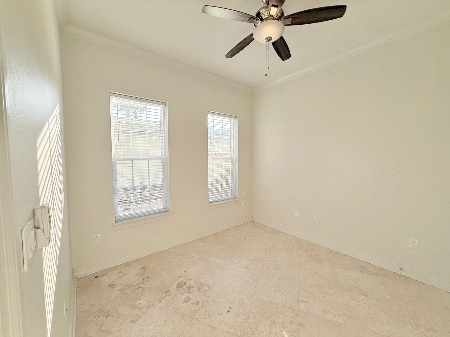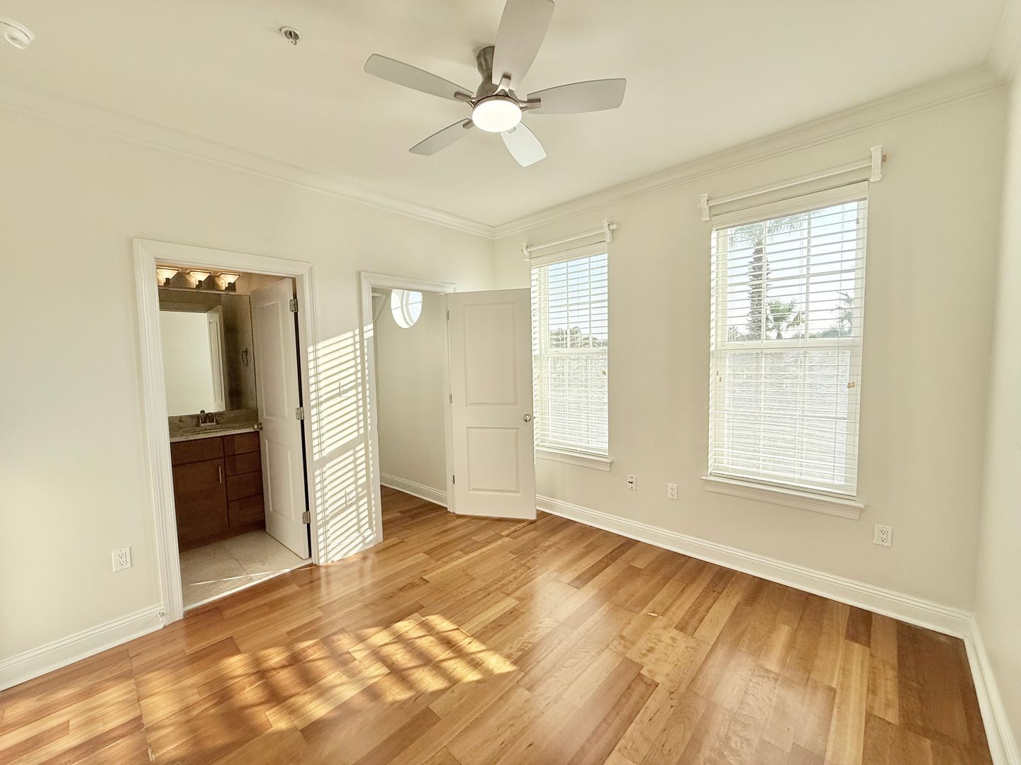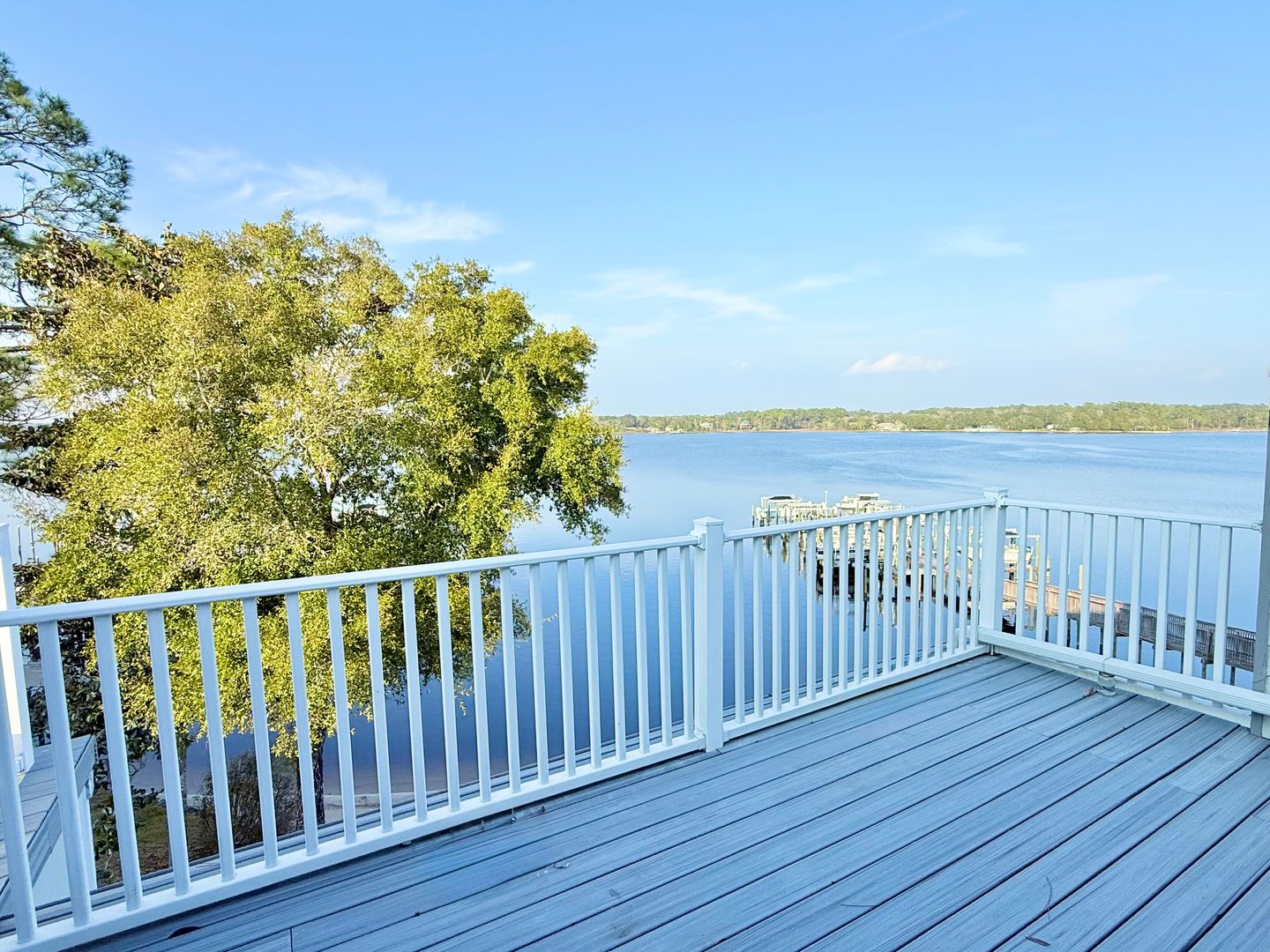 The second level hosts the spacious primary suite, showcasing double French doors that open to a private balcony overlooking the bay. The en-suite bathroom includes an open walk-in shower, separate soaking tub, and double vanity with granite countertops. This floor also offers a laundry area and an additional bedroom with its own private bathroom.