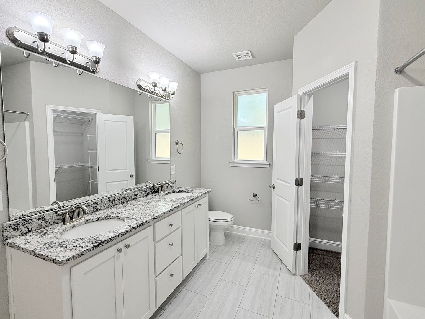 The primary suite boasts a beautiful box ceiling with crown molding, ceiling fan, and a luxurious ensuite bathroom with dual walk-in closets, double vanity, and a tub/shower combo. Two additional bedrooms share a second full bathroom with a single vanity and tub/shower combo.