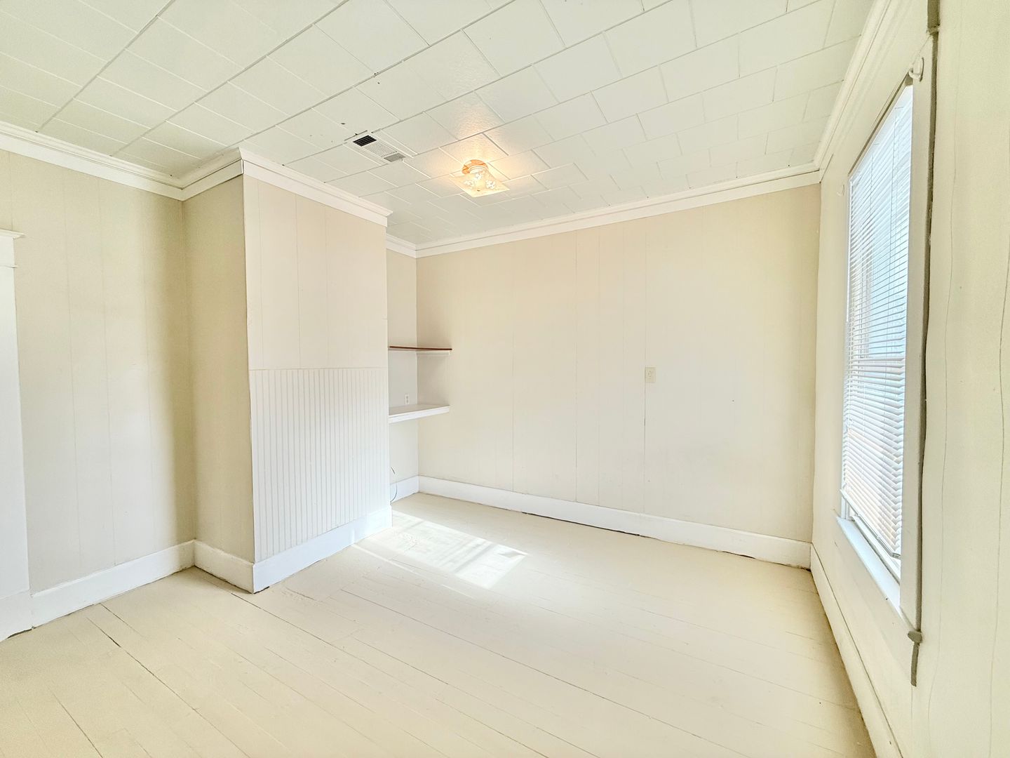 This quaint home offers hardwood and vinyl flooring throughout its 1,240 square foot layout. The large, open kitchen boasts an abundance of cabinetry and comes equipped with a farmhouse sink, flat-top range/oven and standard refrigerator. Each bedroom is well-sized, while the bathroom offers a tub/shower combo, single sink, and storage shelves.