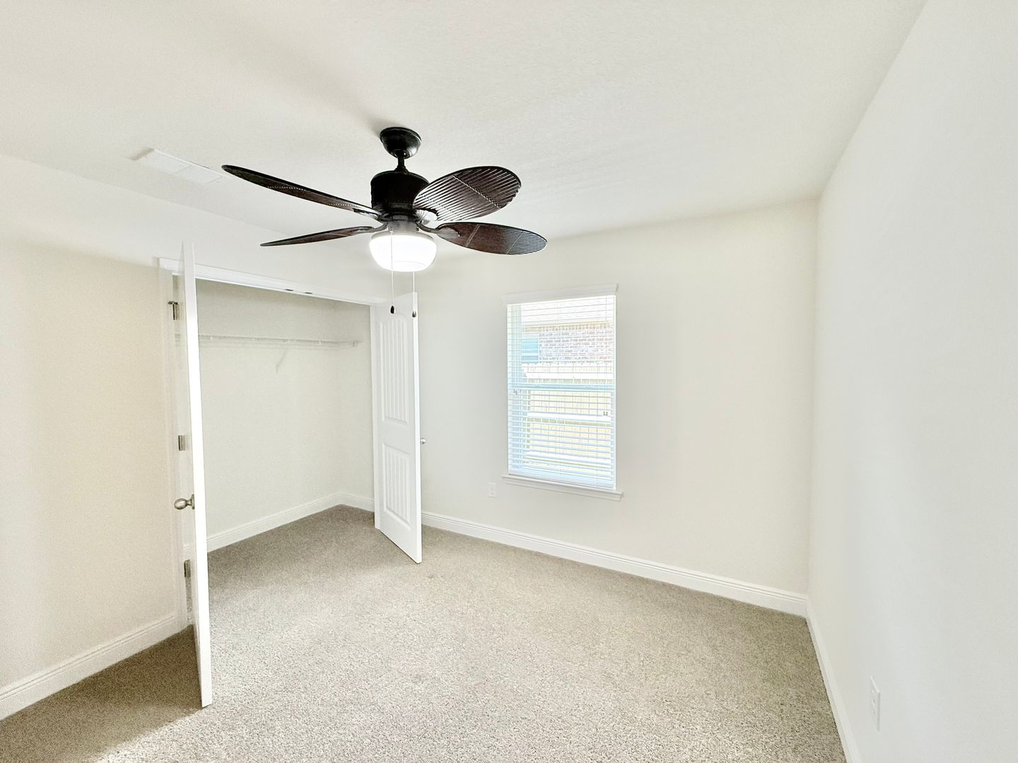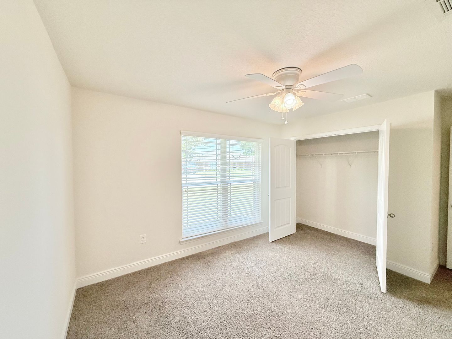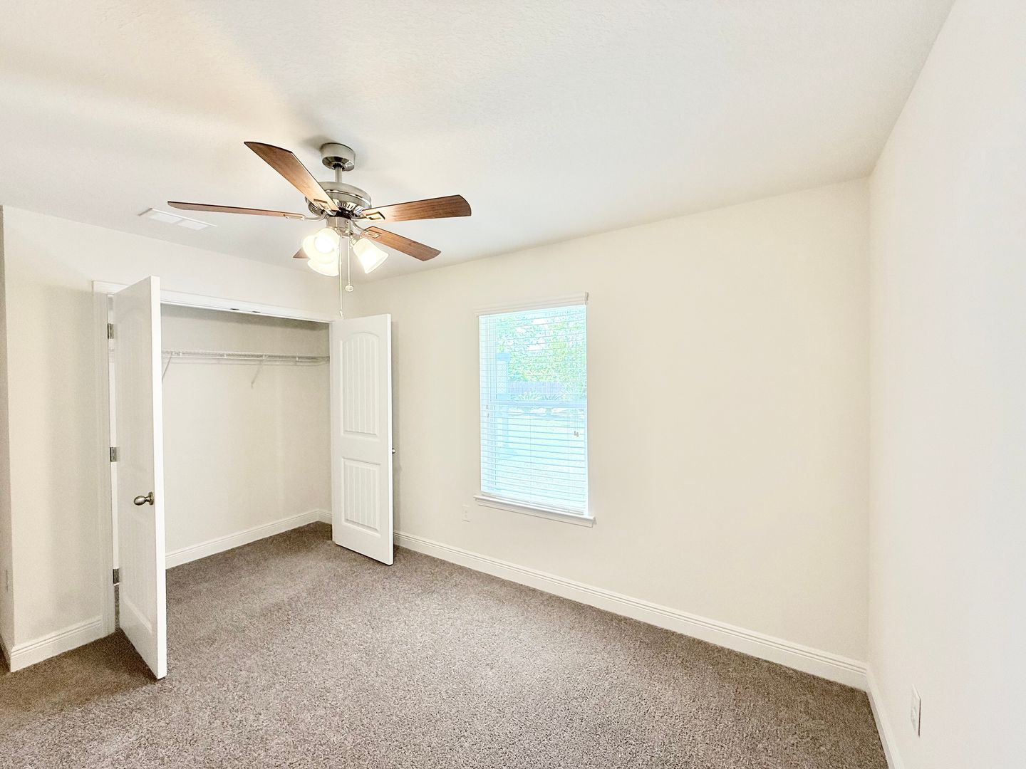 The primary bedroom features plush carpet, a tray ceiling with ceiling fan, and an ensuite bathroom with his-and-hers walk-in closets, dual vanities, and an oversized walk-in shower. Three additional bedrooms each include carpet, ceiling fans, and spacious closets, and share a second full bathroom with a single vanity and tub/shower combo.