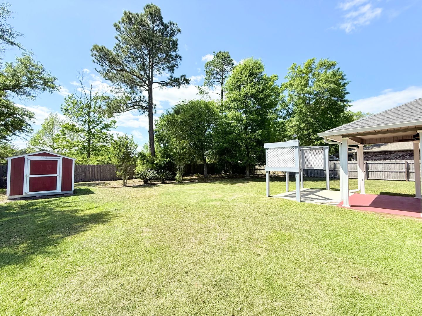 Additional highlights include a laundry room with shelving and space for a full-size washer and dryer, a covered back porch with ceiling fan and extended patio, a storage shed, and a large fully fenced backyard.
