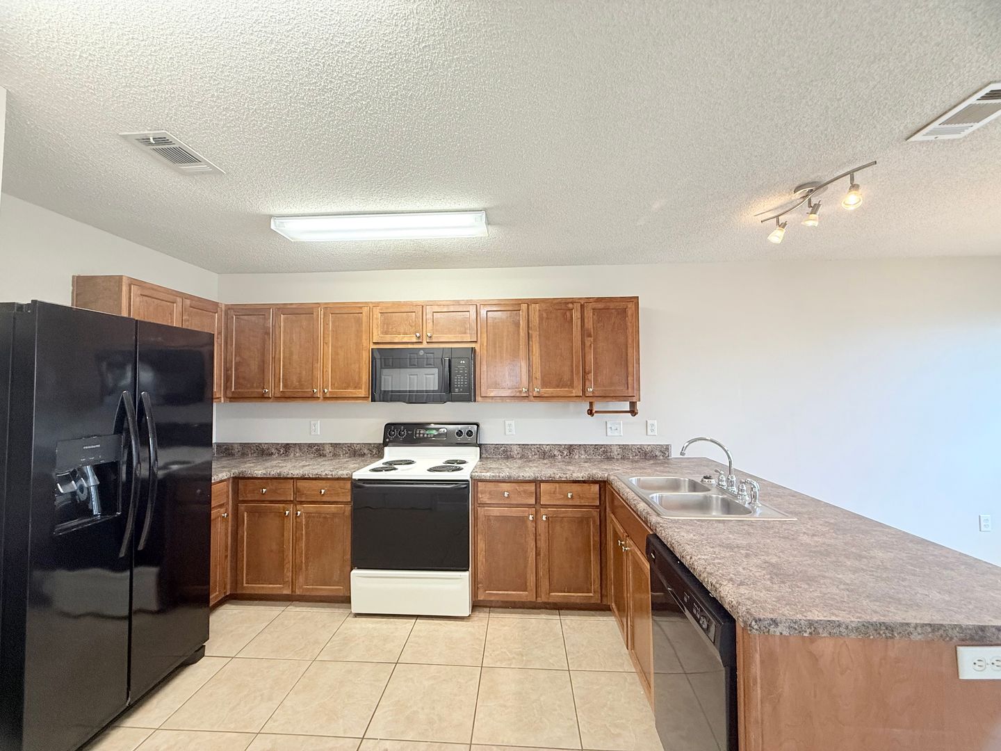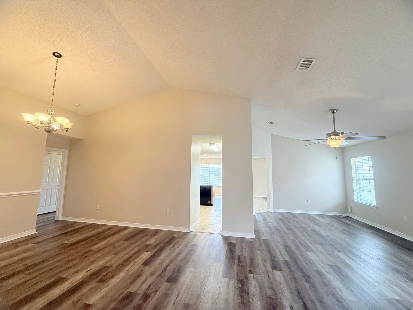 Upon entering, the welcoming foyer opens into a spacious living area featuring soaring vaulted ceilings, elegant plant ledges, and rich wood laminate flooring extending throughout the main living space. The open-concept layout flows seamlessly into a well-appointed kitchen, complete with ample cabinetry, generous countertop space, a peninsula for additional seating, and a cozy eat-in dining area.