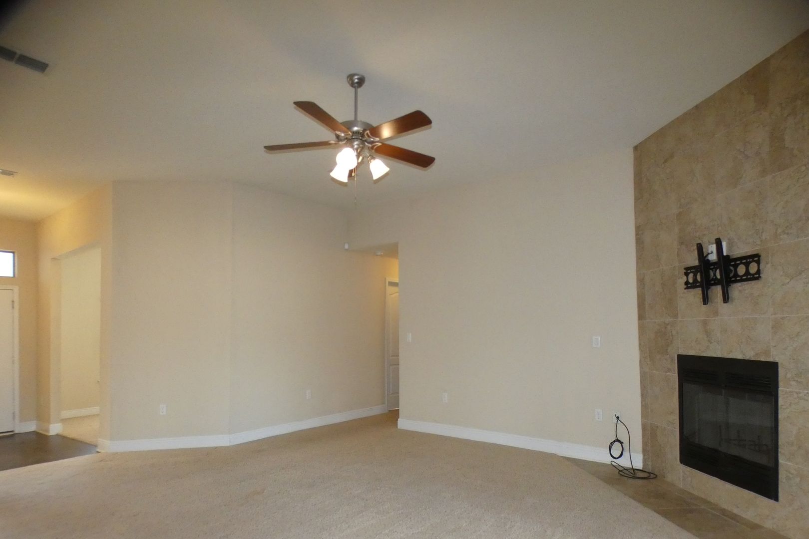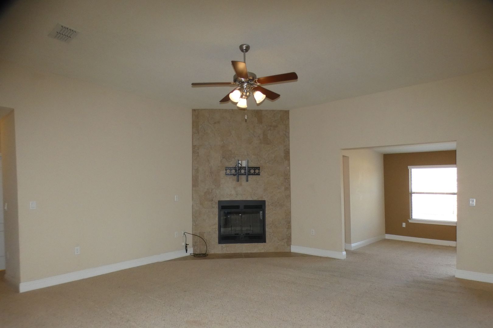 As you enter the home, a dedicated office/den is located to the left and a formal dining room to the right, offering great flexibility for work and entertaining. The spacious living room features a corner-tiled wood-burning fireplace, high ceilings, and a ceiling fan. The kitchen is well-equipped with granite countertops, dark wood cabinetry, a center island, pantry, dual-basin undermount sink, and stainless steel appliances including a French door refrigerator, flat top range/oven, built-in microwave, and dishwasher.