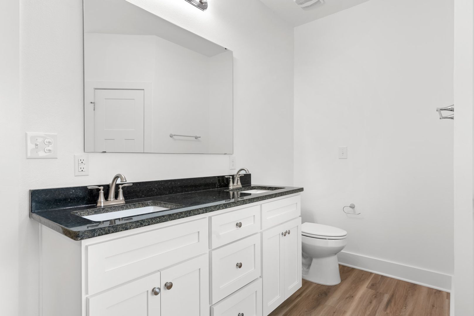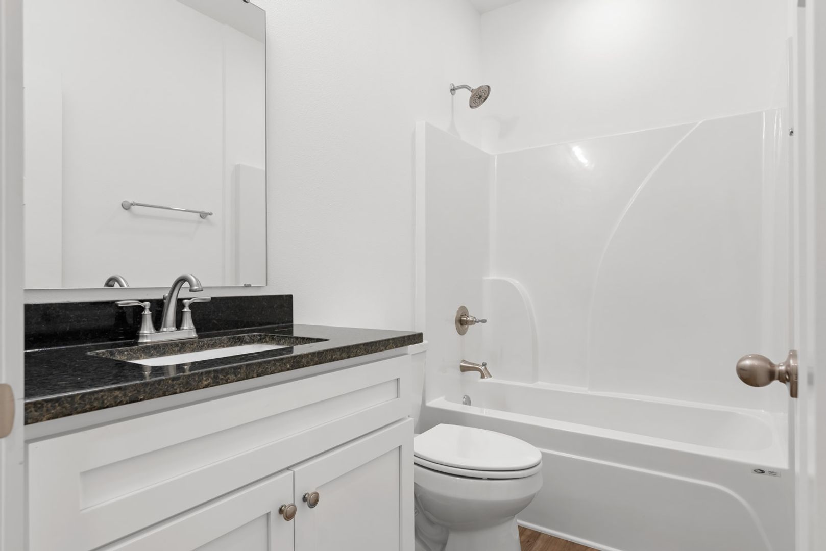 The living room is filled with natural light from a wall of windows and opens into the modern kitchen, which features a hop-up bar and an eat-in breakfast area overlooking the front yard. Stainless steel appliances compliment the granite countertops and white cabinetry. The dedicated office includes a closet and direct access to the backyard, making it an ideal space for working from home or a flexible fourth bedroom. All bedrooms include ceiling fans for added comfort. The primary bedroom offers an ensuite bath with dual granite vanities, garden tub, and a separate walk-in shower. The two additional bedrooms share a second full bath with single granite vanity and a tub/shower combo.