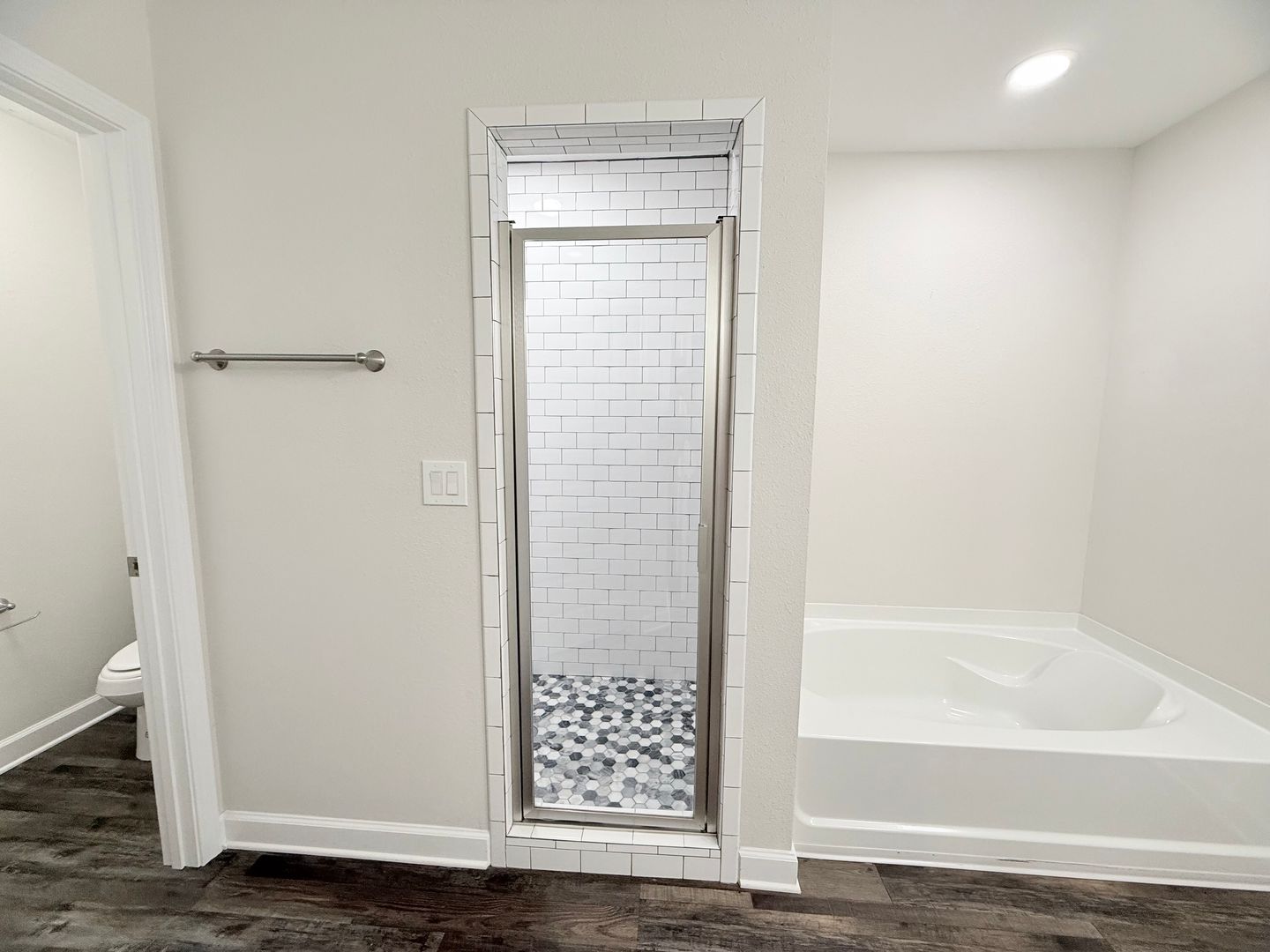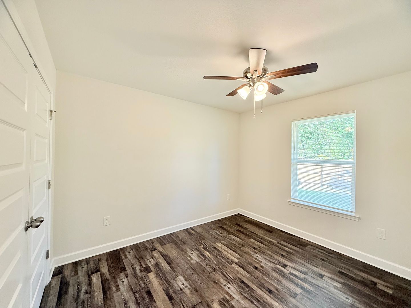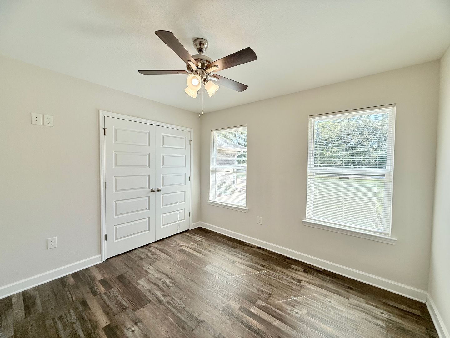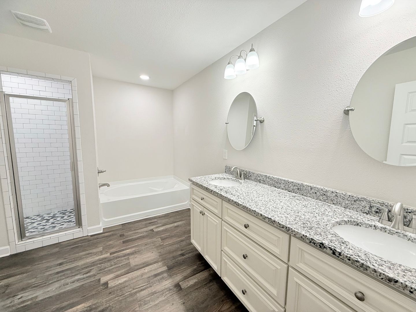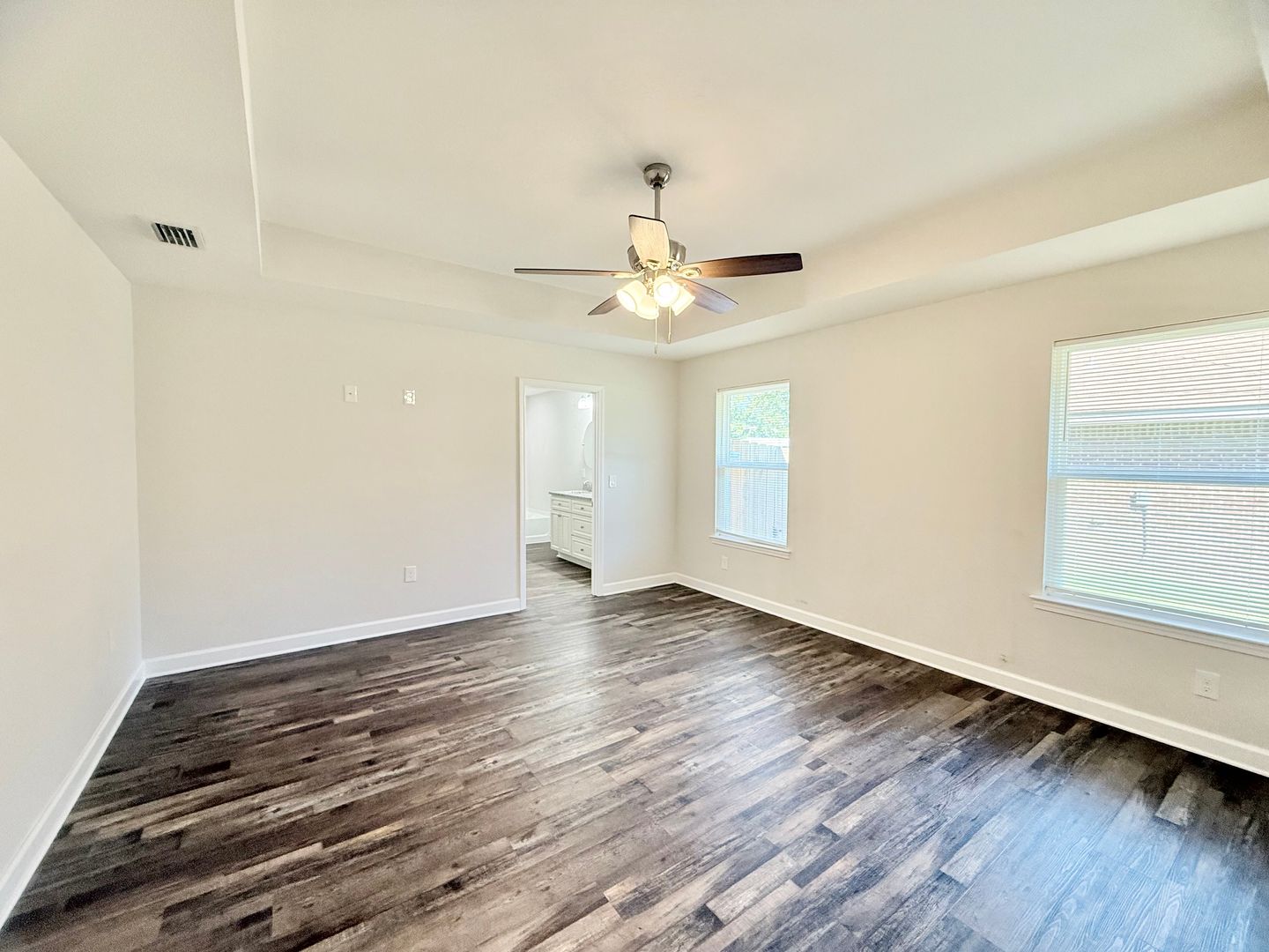 The primary suite includes a walk-in closet and a luxurious ensuite bath with dual vanities, a garden tub, separate shower, ceiling fan, and a private water closet. Two additional bedrooms each feature double closets and ceiling fans, and share a second full bath with single vanity and tub/shower combo.