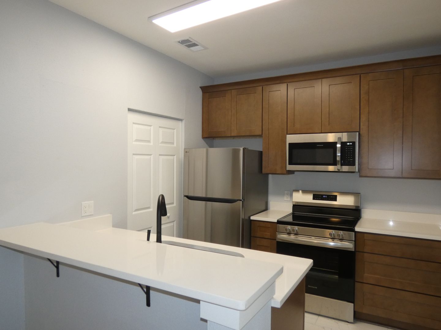The renovated kitchen features granite countertops, new cabinetry, a large undermount sink, and stainless steel appliances including a refrigerator, flat-top range/oven, built-in microwave, and dishwasher. Just off the kitchen is a dedicated laundry area with space for a full size washer and dryer.