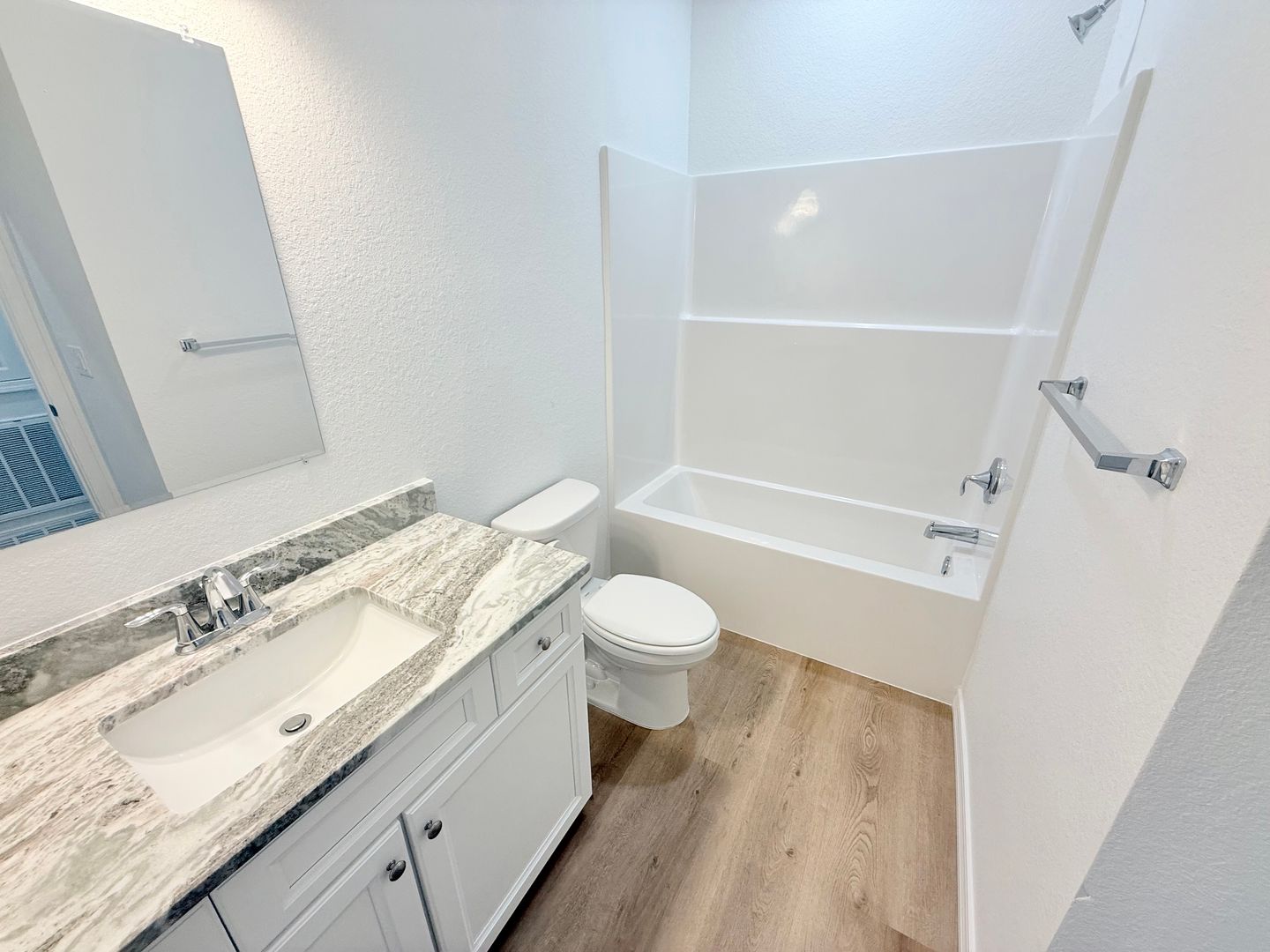 The master suite provides a peaceful retreat with a large walk-in closet and an ensuite bathroom featuring a private water closet, dual vanities, and a standing shower. Three additional bedrooms share a second full bath with a single vanity and a tub/shower combo.