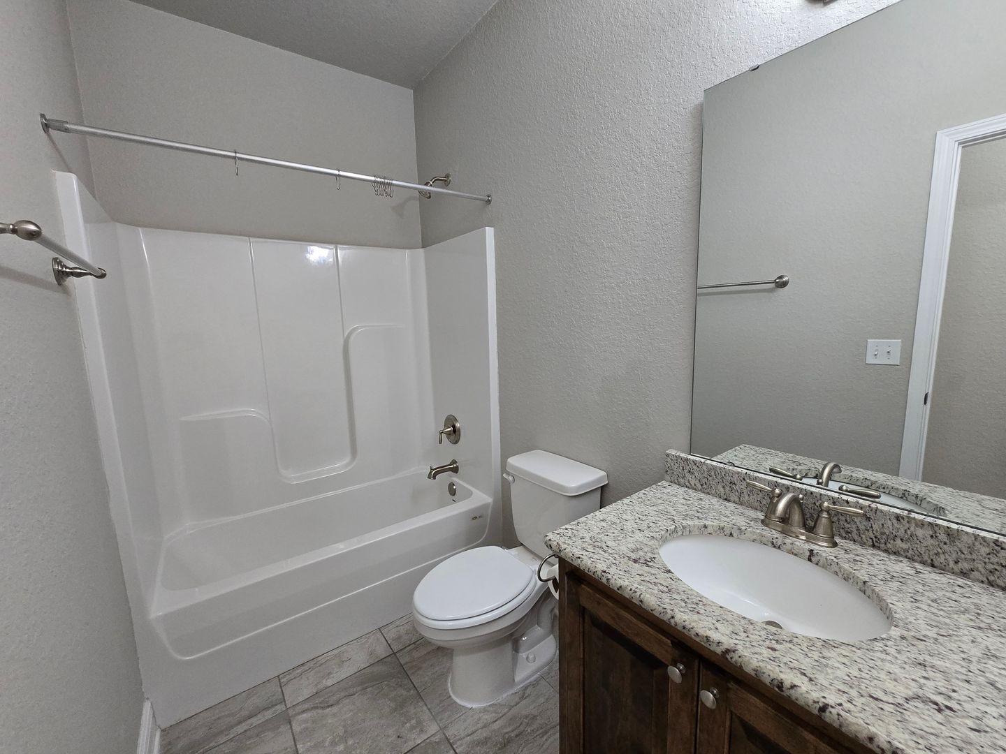 The primary suite also features a coffered ceiling with a ceiling fan and a spacious ensuite bathroom with dual granite vanities, a private water closet, garden tub, separate walk-in shower, and a walk-in closet. Two additional bedrooms share a second full bath with a single granite vanity and a tub/shower combo.