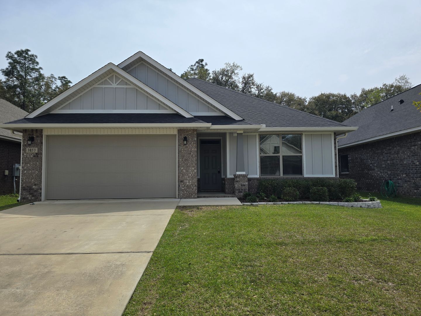 This Craftsman-style home is centrally located in Pace and offers a spacious, open-concept layout with luxury vinyl plank flooring in the main living areas and carpet in the bedrooms.