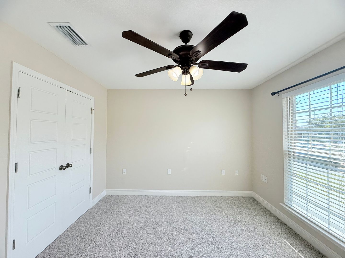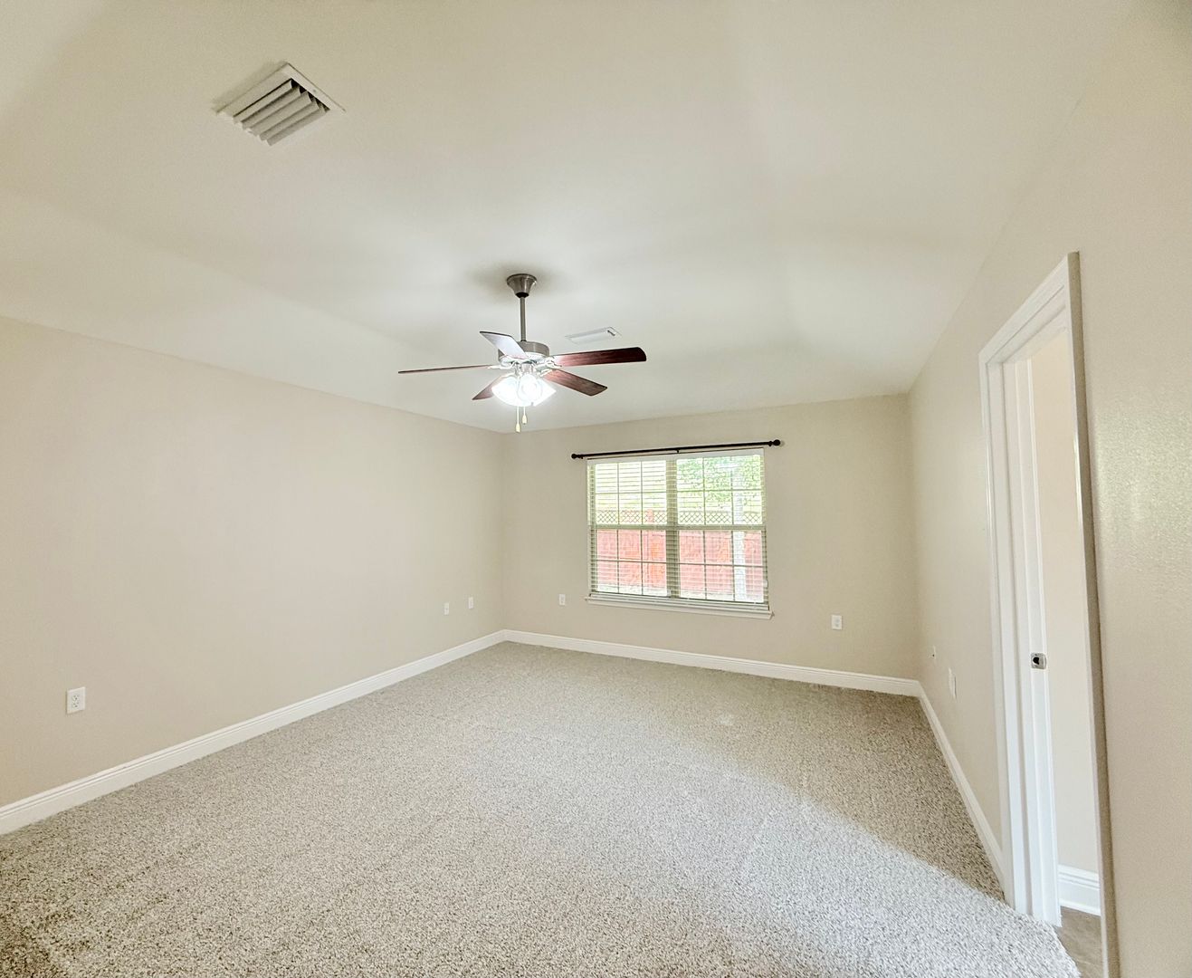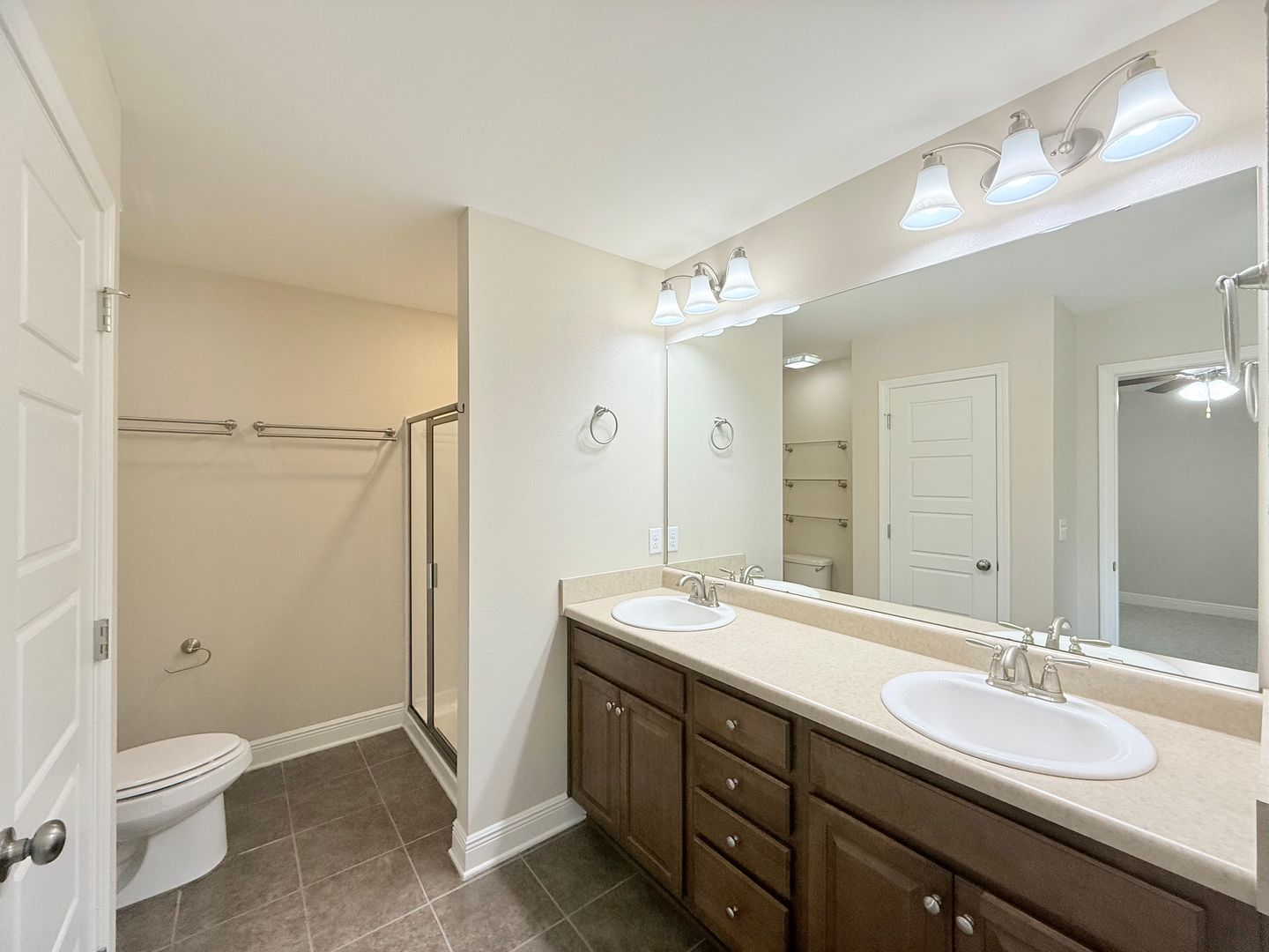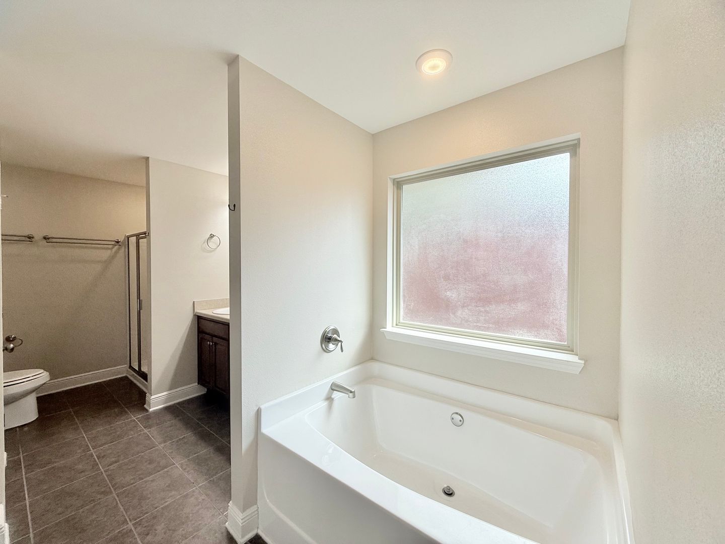 The private master suite offers a relaxing retreat with plush carpet, a large walk-in closet, and a luxurious ensuite bathroom complete with dual vanities, a garden tub, and separate shower. Two additional bedrooms share a well-appointed second full bath with single vanity and tub/shower combo.