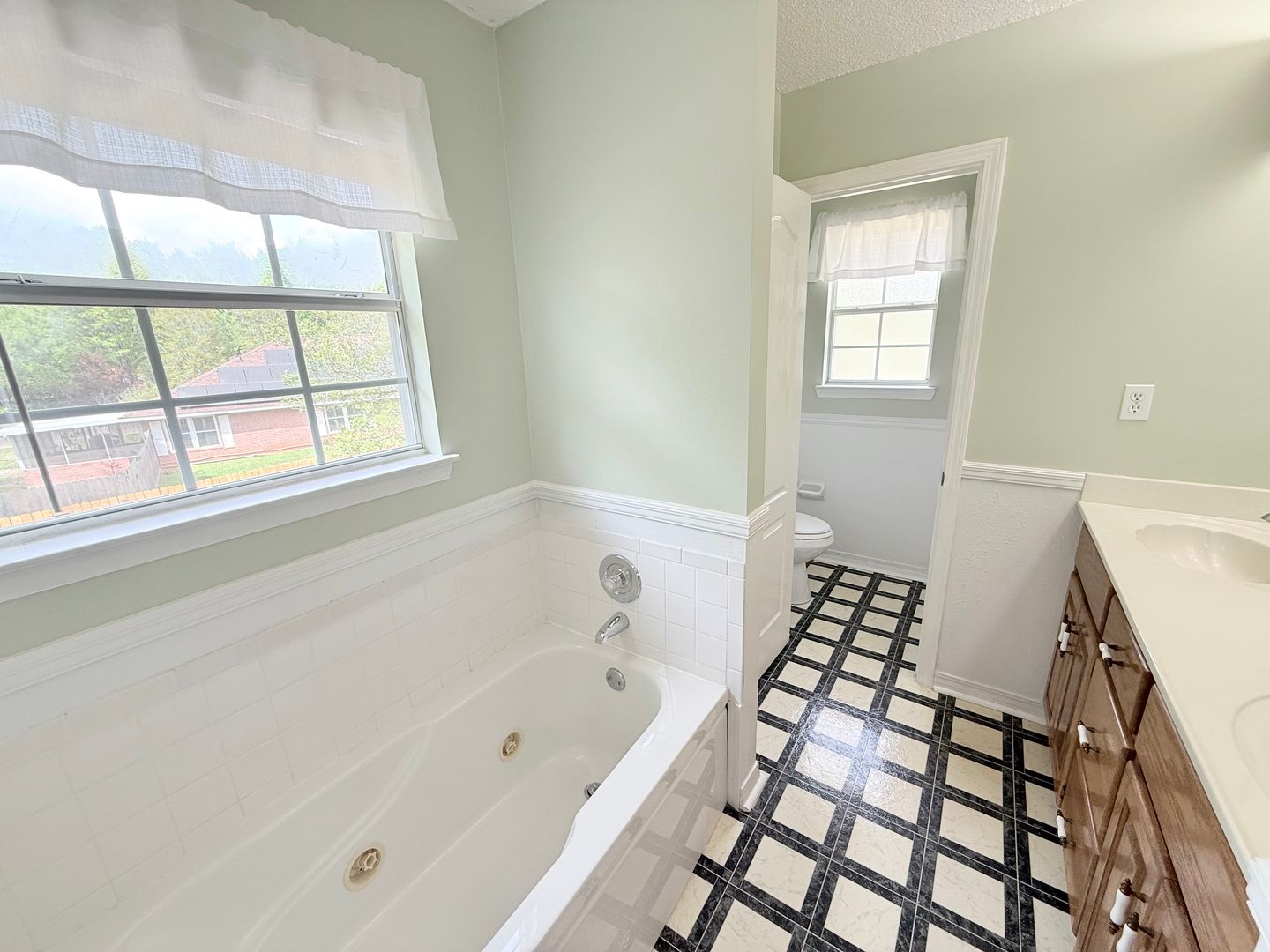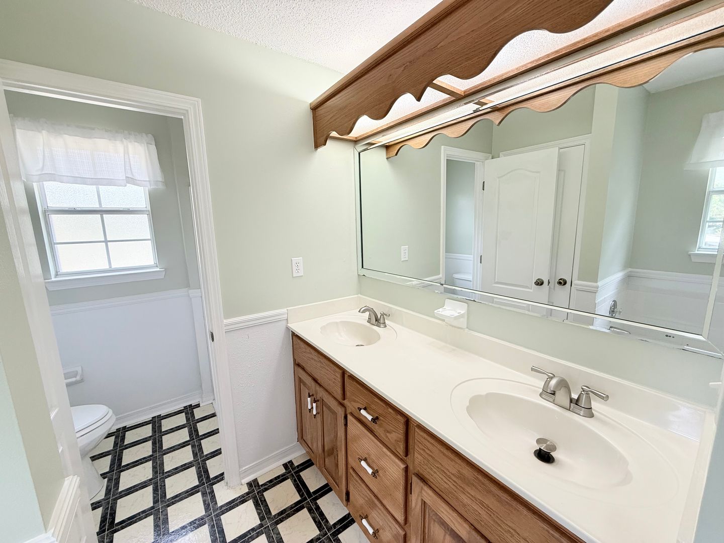 Upstairs, you’ll find four generously sized bedrooms with plush carpeting and two full bathrooms. The ensuite master bath boasts dual vanities, a soaking tub, and a private water closet. The second full bath offers a single vanity and a tub/shower combo. Additionally, the home is equipped with dual HVAC systems for added energy efficiency and comfort as well as a large laundry room with storage cabinets and a full size washer and dryer provided.