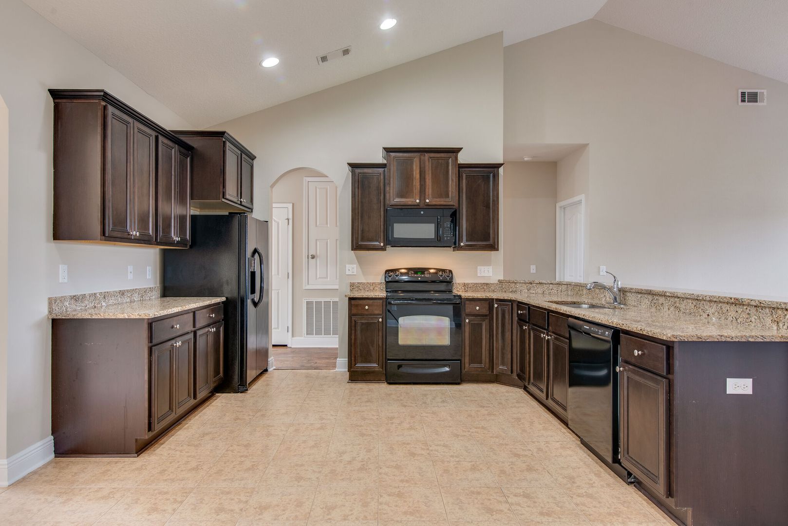 The living room features vaulted ceilings, a wood-burning fireplace, and access to the covered back patio. The stunning kitchen features tile flooring, granite countertops, dark wood cabinetry, a dual-basin undermount sink, and all essential appliances including a built-in microwave, smooth-top stove, side-by-side refrigerator, and dishwasher. Additionally, a large wraparound breakfast bar provides ample space for entertaining.