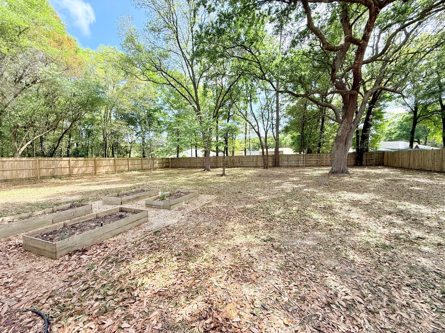 Additional highlights include a washer and dryer, an enclosed back porch, and a huge fully-fenced backyard with raised garden beds and a small patio.