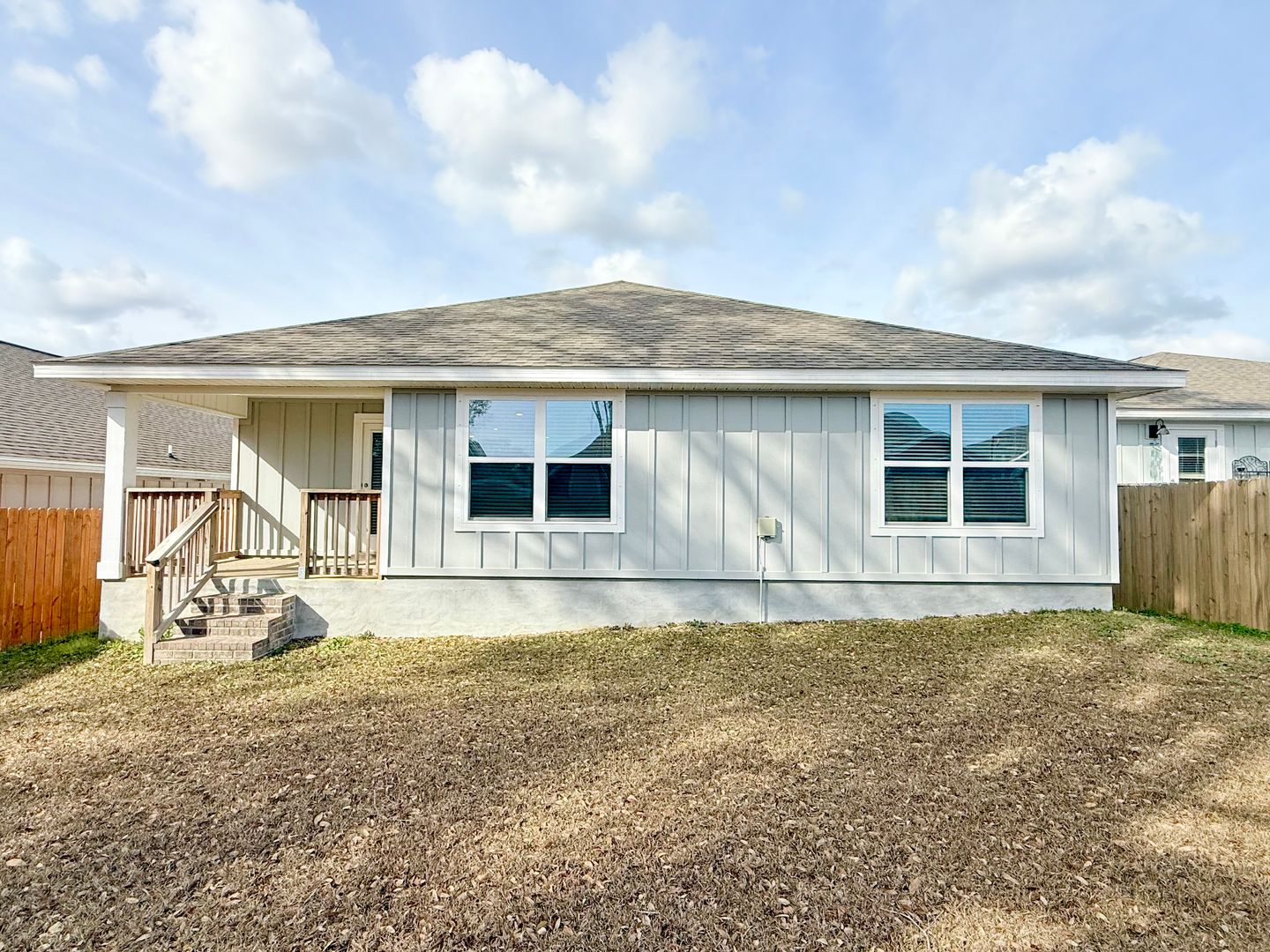 Additional highlights include a dedicated laundry room with full-size washer and dryer provided, a covered deck overlooking the backyard, and access to the community pool and playground.