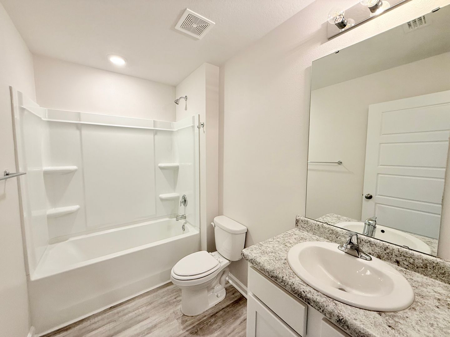 The primary suite is tucked just off the living area and features a spacious walk-in closet and a beautiful ensuite bathroom with dual vanities, a private water closet, and a large walk-in shower. The three additional bedrooms share a second full bath with a single vanity and tub/shower combo.