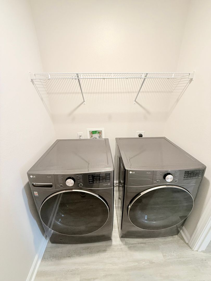 As you enter, three guest bedrooms are located toward the front, each featuring sizable closets. Toward the back, you’ll find a spacious open-concept living area that seamlessly connects to the modern kitchen and dining area. The kitchen is well-equipped with a large center island with hop-up bar, dual-basin sink, spacious pantry, and stainless steel appliances including a French door refrigerator, flat top range, built-in microwave, and a dishwasher.