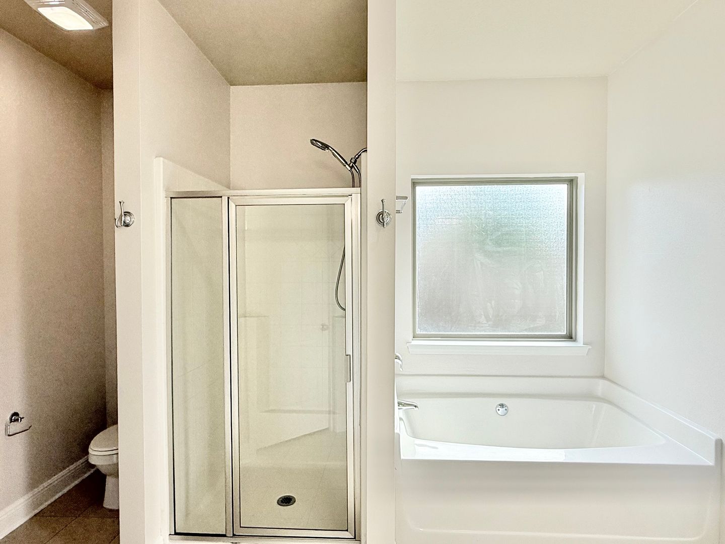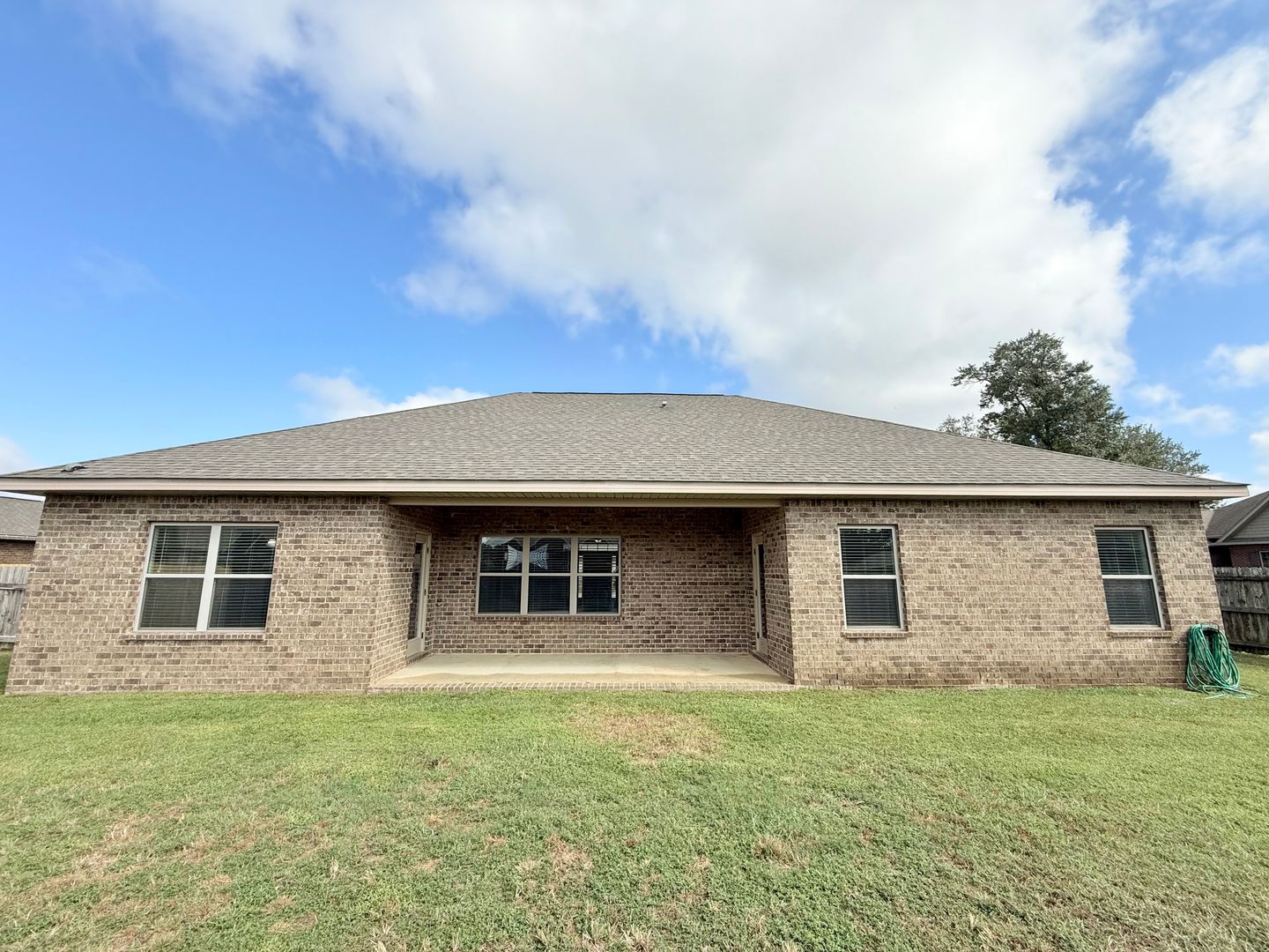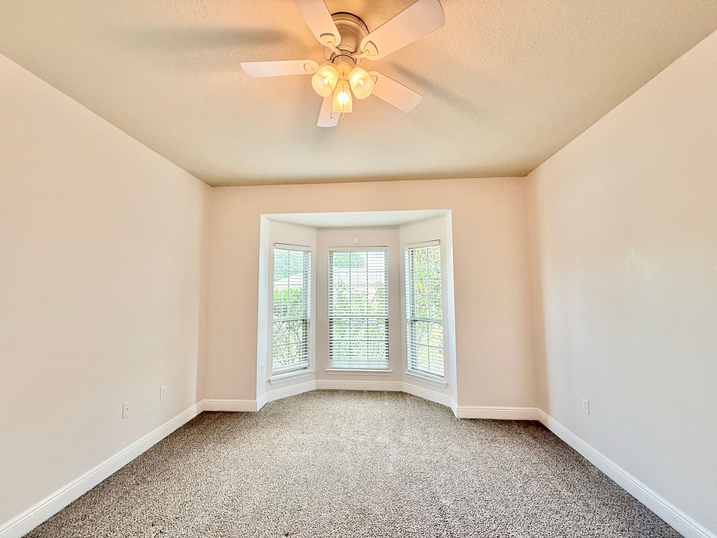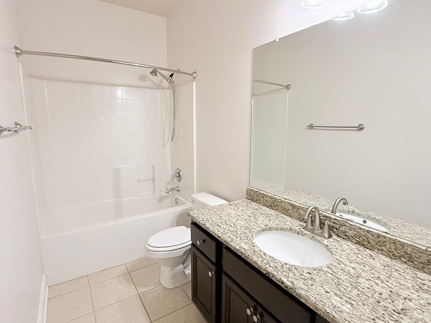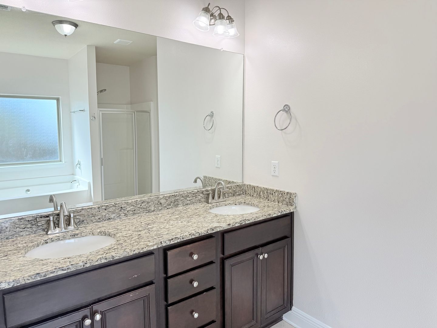 The expansive master suite includes a tray ceiling, private access to the covered back patio, and a luxurious ensuite bathroom with dual granite vanities, a relaxing garden tub, separate shower, and an oversized walk-in closet. Two additional bedrooms are generously sized with ceiling fans and ample closet storage. They share a second full bath with single granite vanity and tub/shower combo.