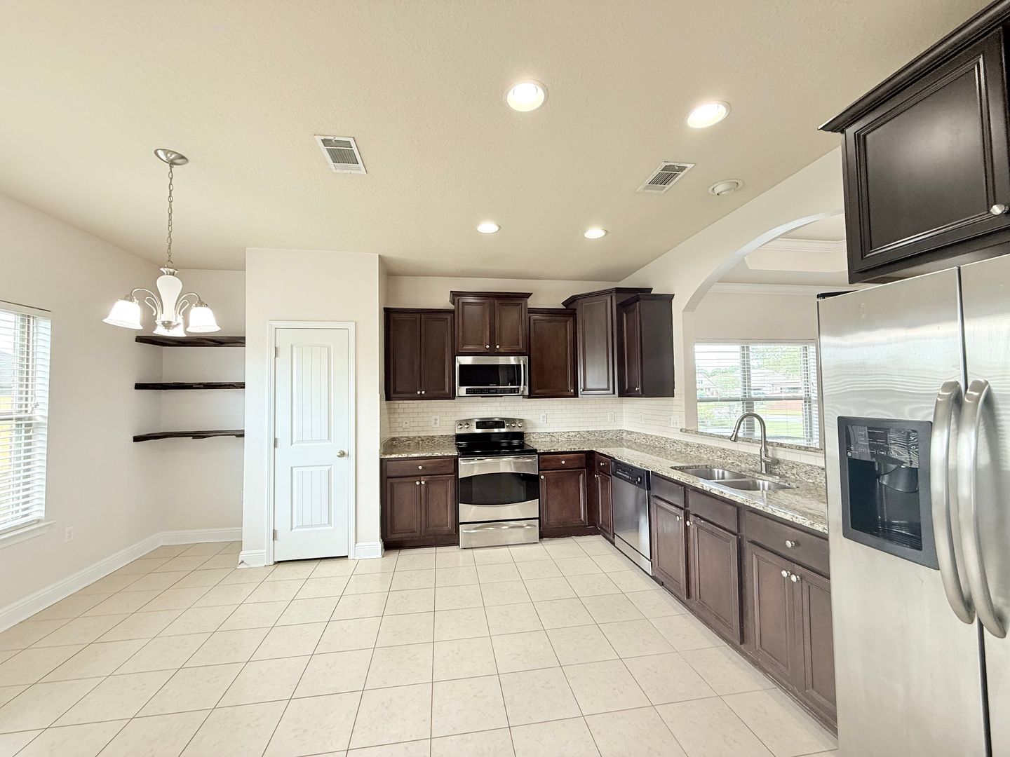 Step inside from the inviting covered front porch to a wood-floored entryway that opens into a bright, airy living room, complete with a double-step tray ceiling. A formal dining area overlooks both the kitchen and living room, with a sit-down bar that’s ideal for entertaining. The kitchen features granite countertops, stainless steel appliances, tile flooring, ample cabinet space, and a cozy breakfast nook.