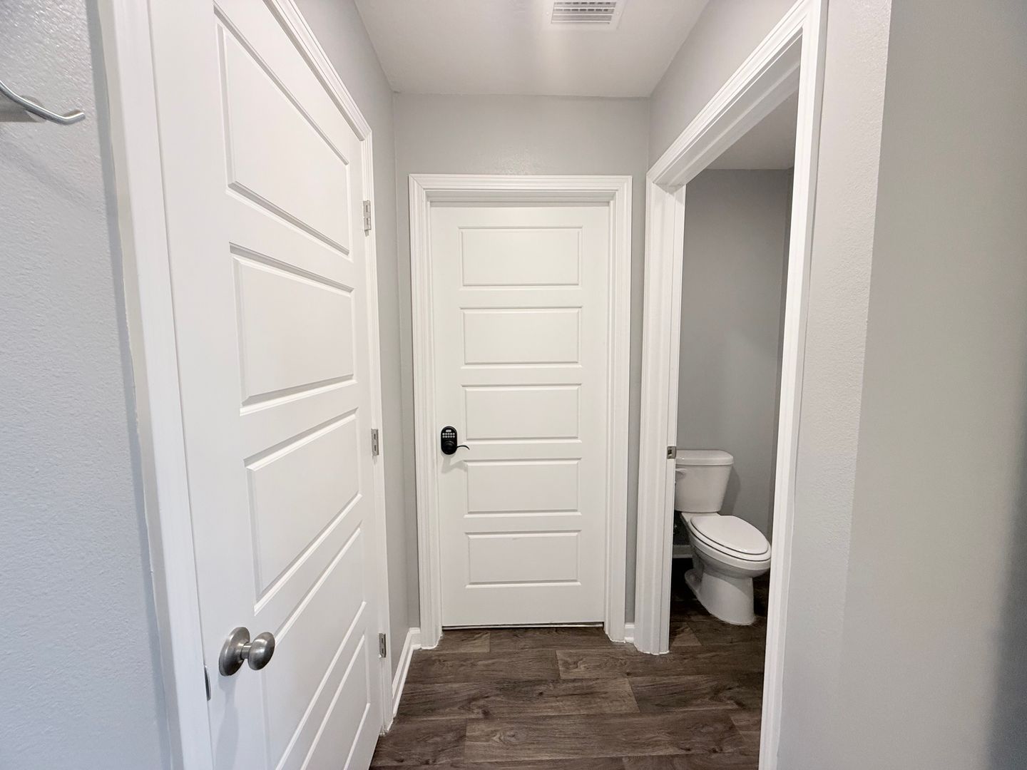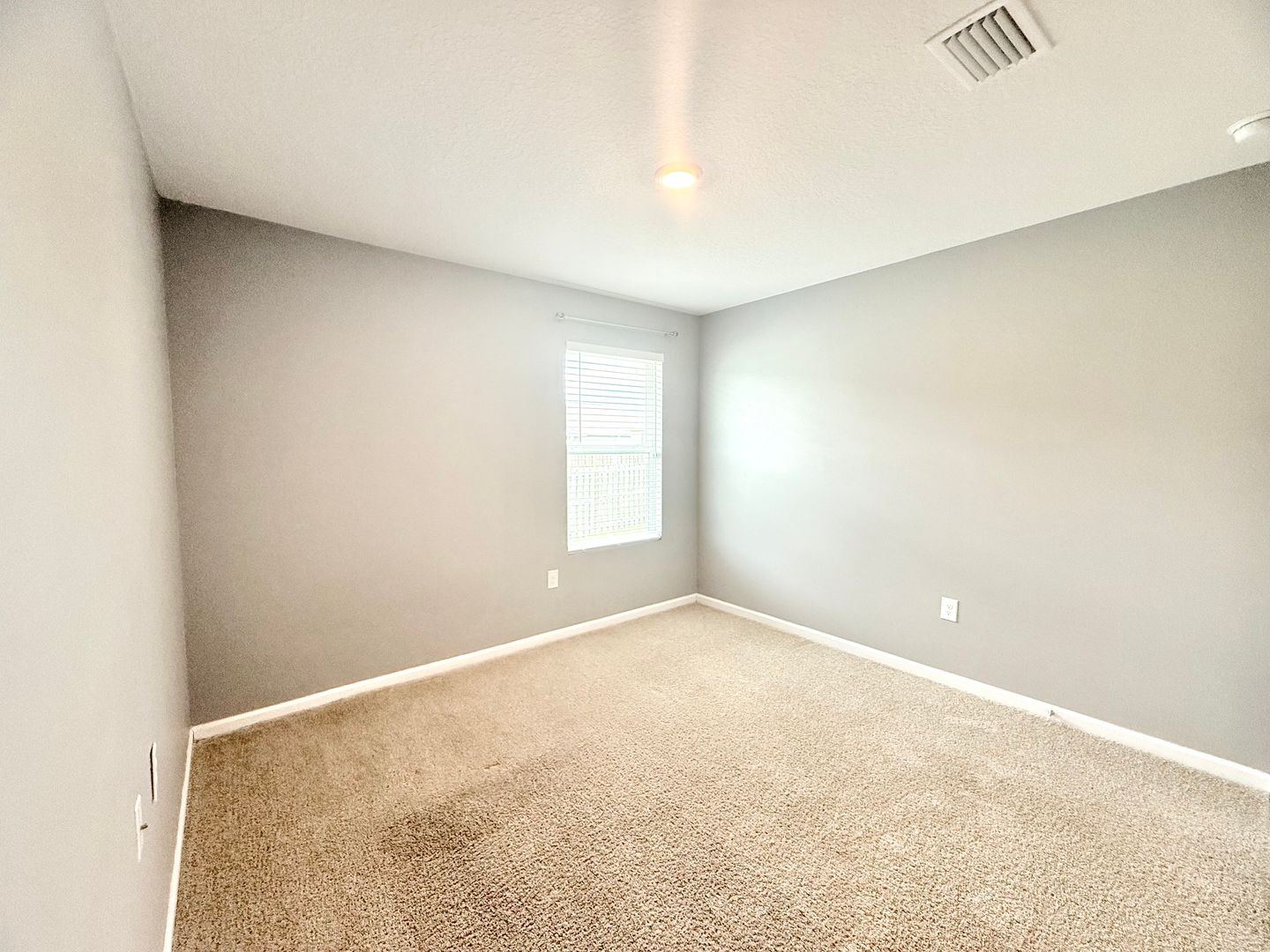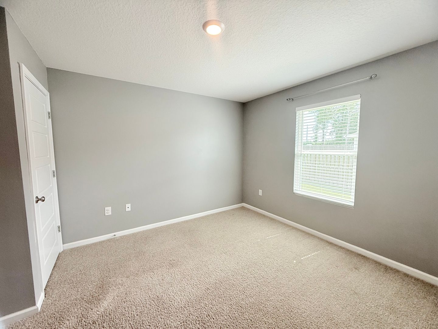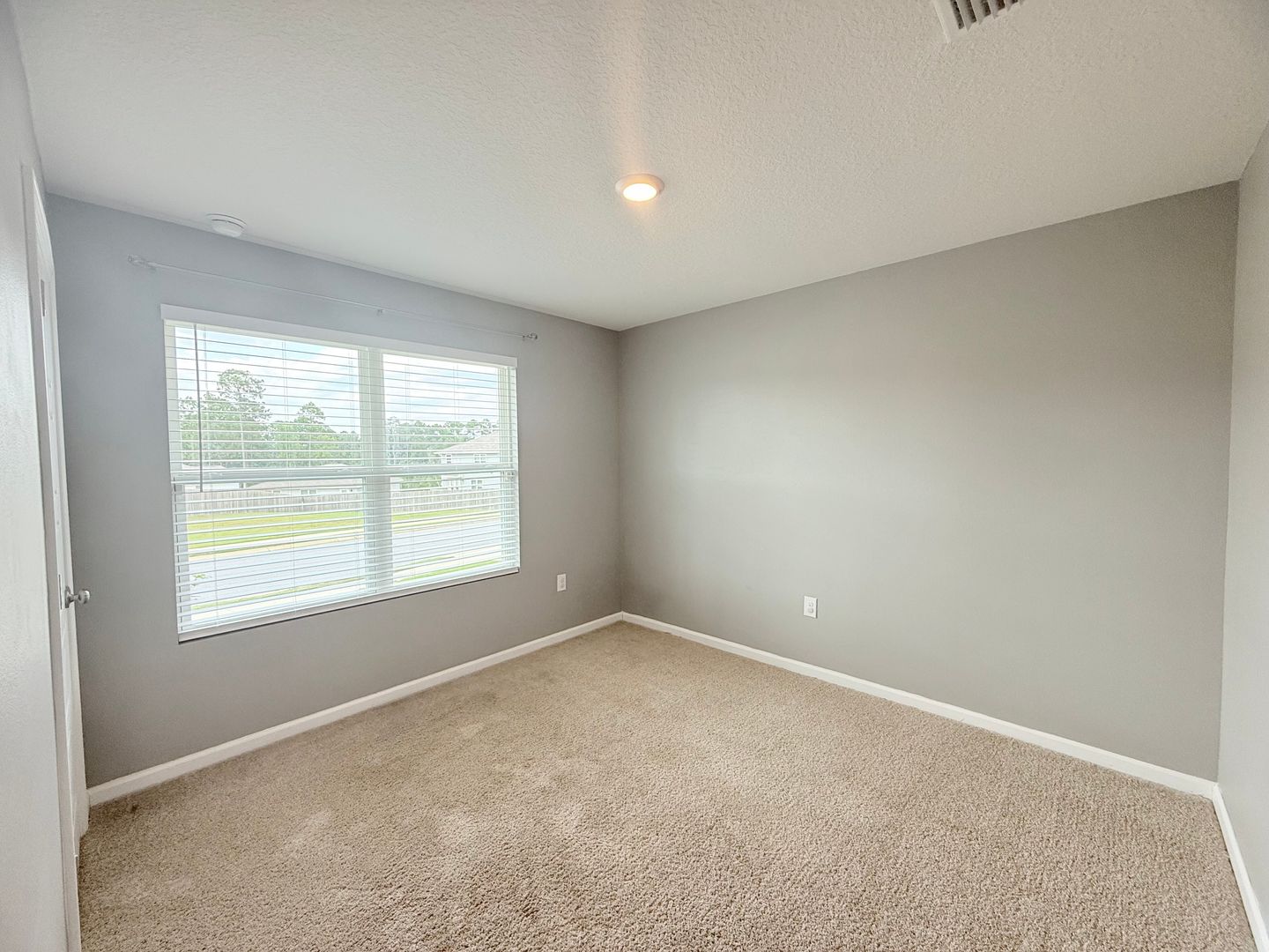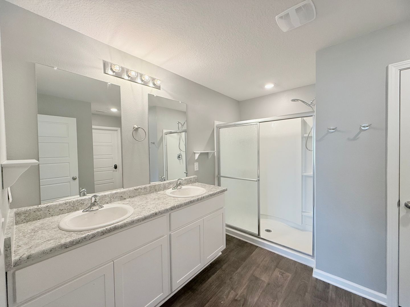 The master bedroom overlooks the backyard and includes an en-suite bathroom with a large walk-in shower, dual vanities, a private water closet, and a spacious walk-in closet. Two additional bedrooms are located at the front of the home near a second full bathroom, while the fourth bedroom is situated on the opposite side—perfect for guests, a home office, or added privacy.