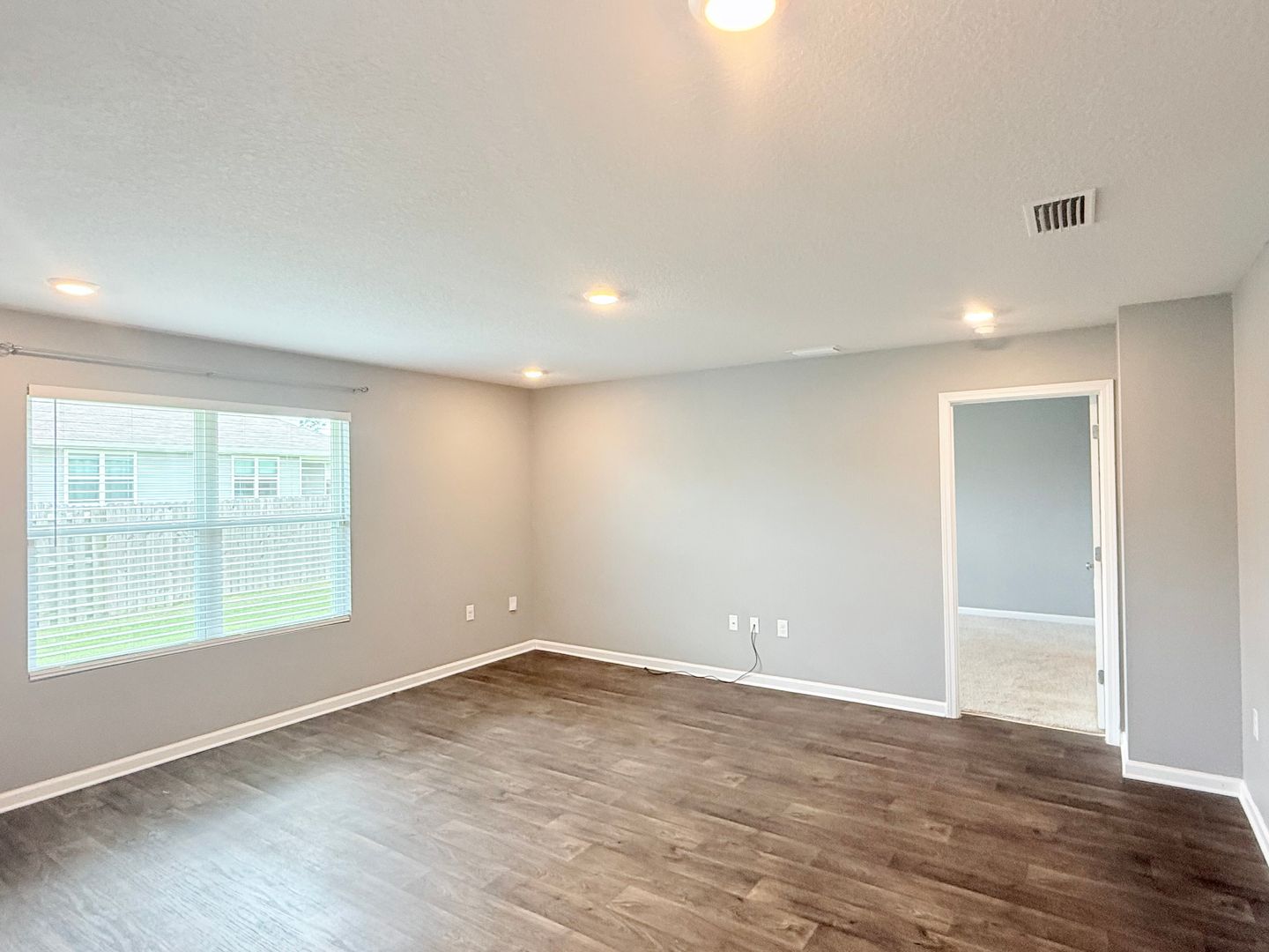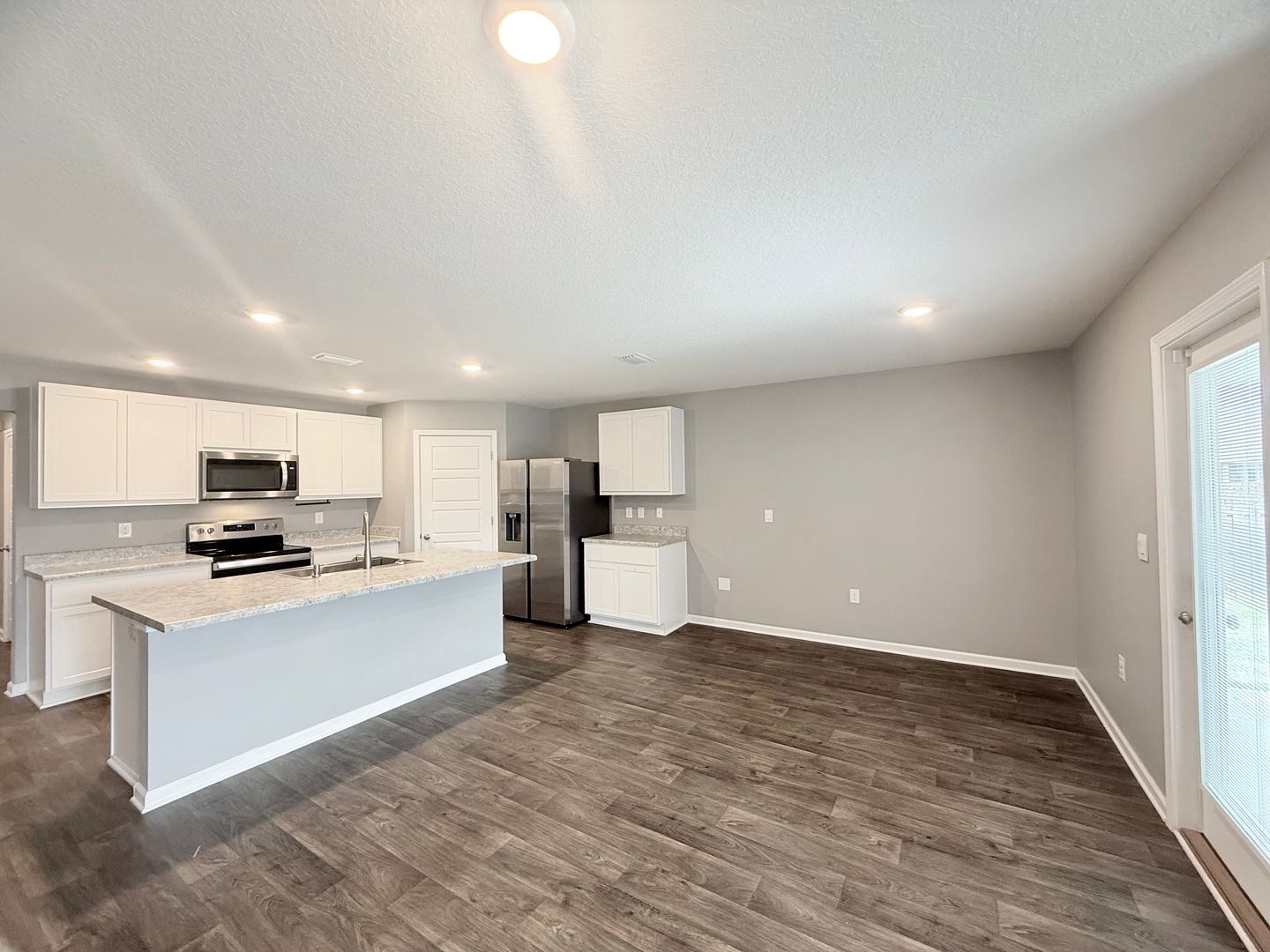 The open-concept Great Room provides a versatile space and a warm, inviting atmosphere. The kitchen is a chef’s dream, featuring a large center island, walk-in pantry, ample cabinet and counter space, and stainless steel appliances—including a built-in microwave, smooth top range, dishwasher, and refrigerator.