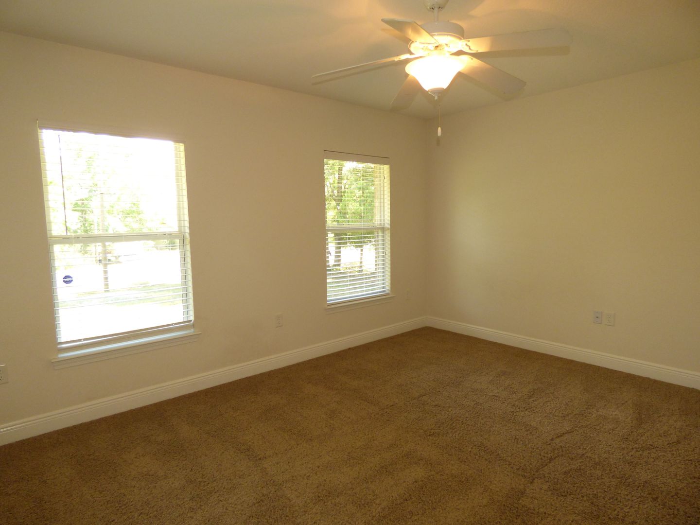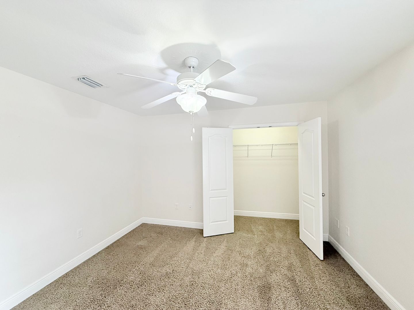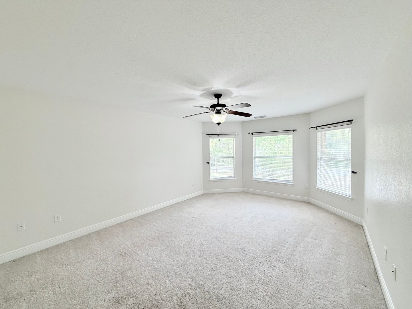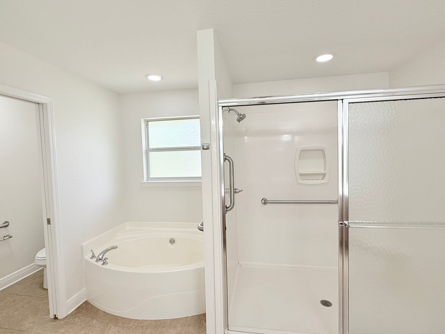 The primary suite is generously sized with carpeted flooring and a ceiling fan for added comfort. The attached ensuite bath offers a luxurious retreat with a huge walk-in shower, soaking tub, double vanity, and walk-in closets. The additional bedrooms are spacious, each with ceiling fans, cozy carpet, and ample closet space. They share a second full bathroom with a single vanity and tub/shower combo.