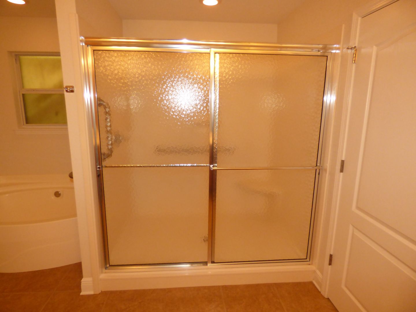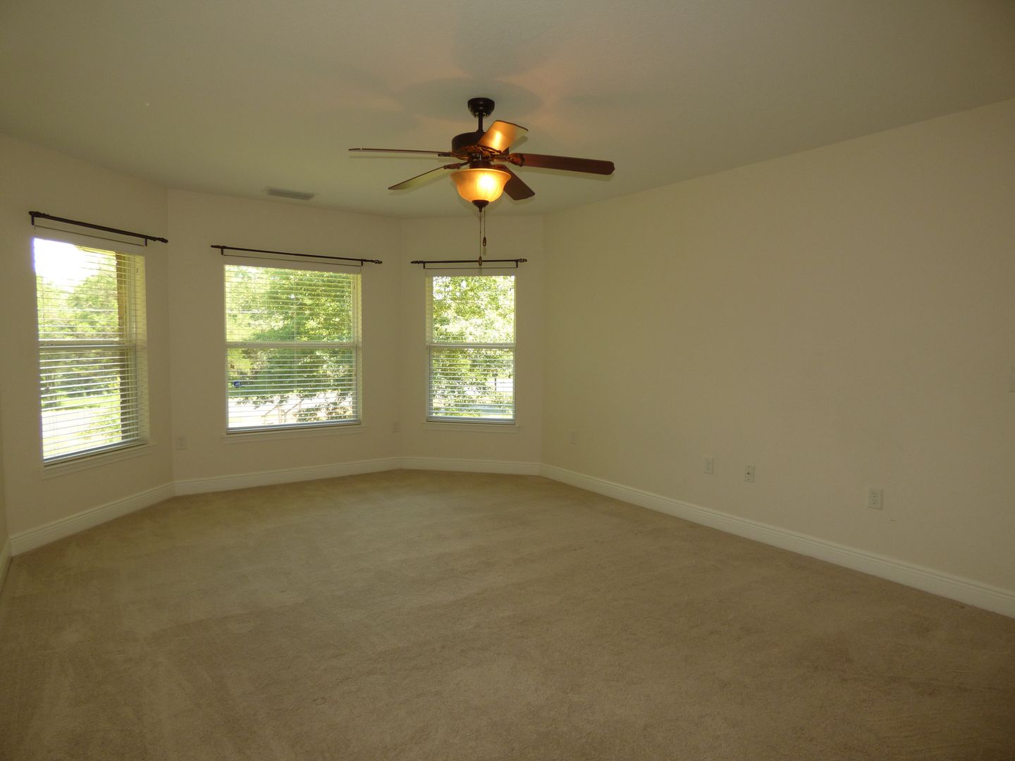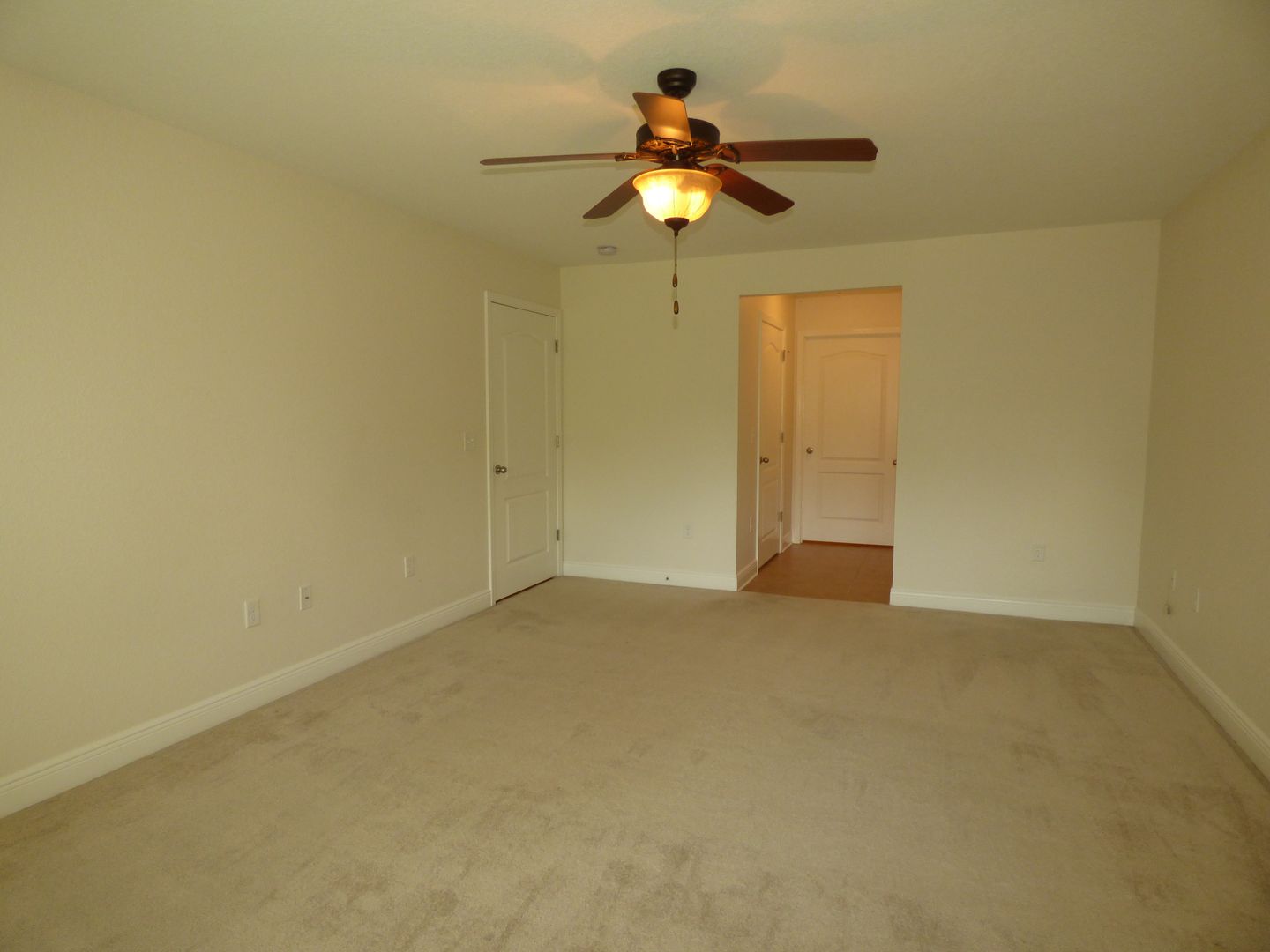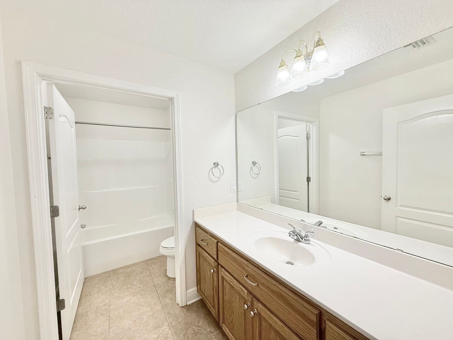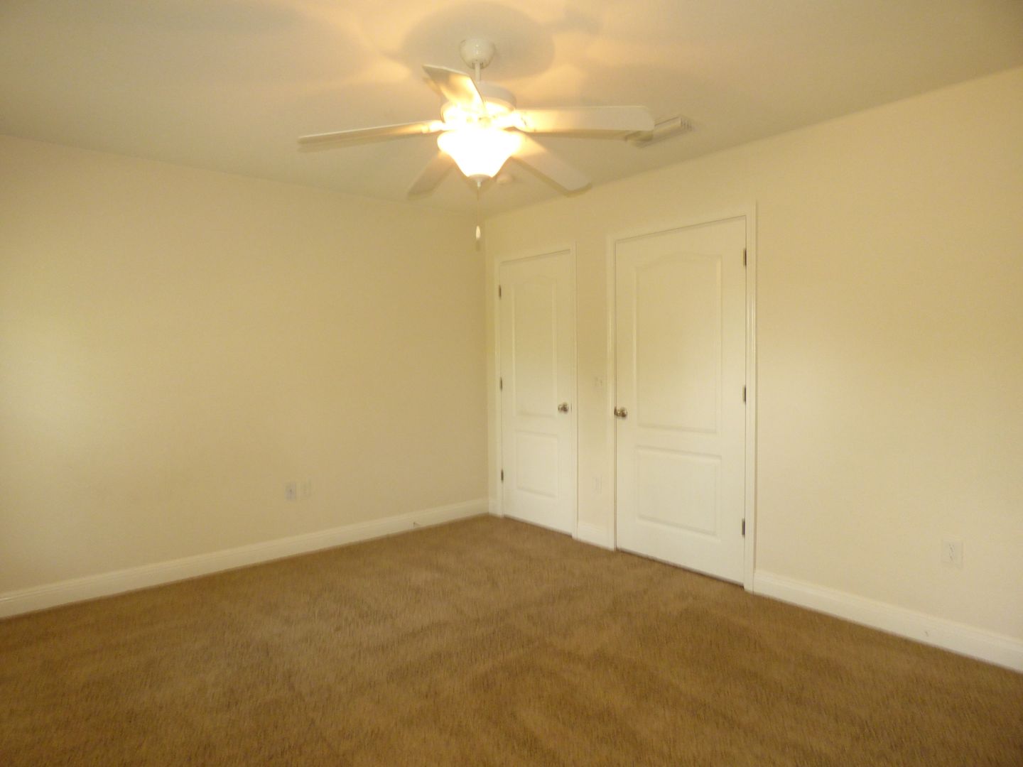 The primary suite is generously sized with carpeted flooring and a ceiling fan for added comfort. The attached ensuite bath offers a luxurious retreat with a huge walk-in shower, soaking tub, double vanity, and walk-in closets. The additional bedrooms are spacious, each with ceiling fans, cozy carpet, and ample closet space. They share a second full bathroom with a single vanity and tub/shower combo.