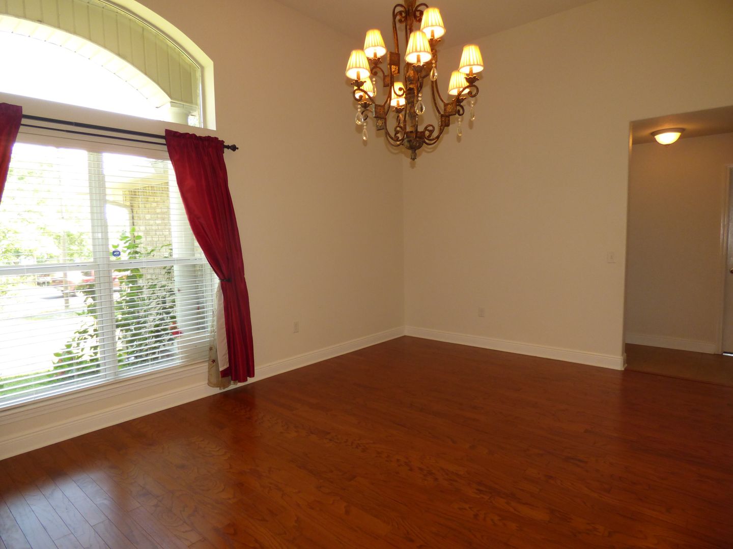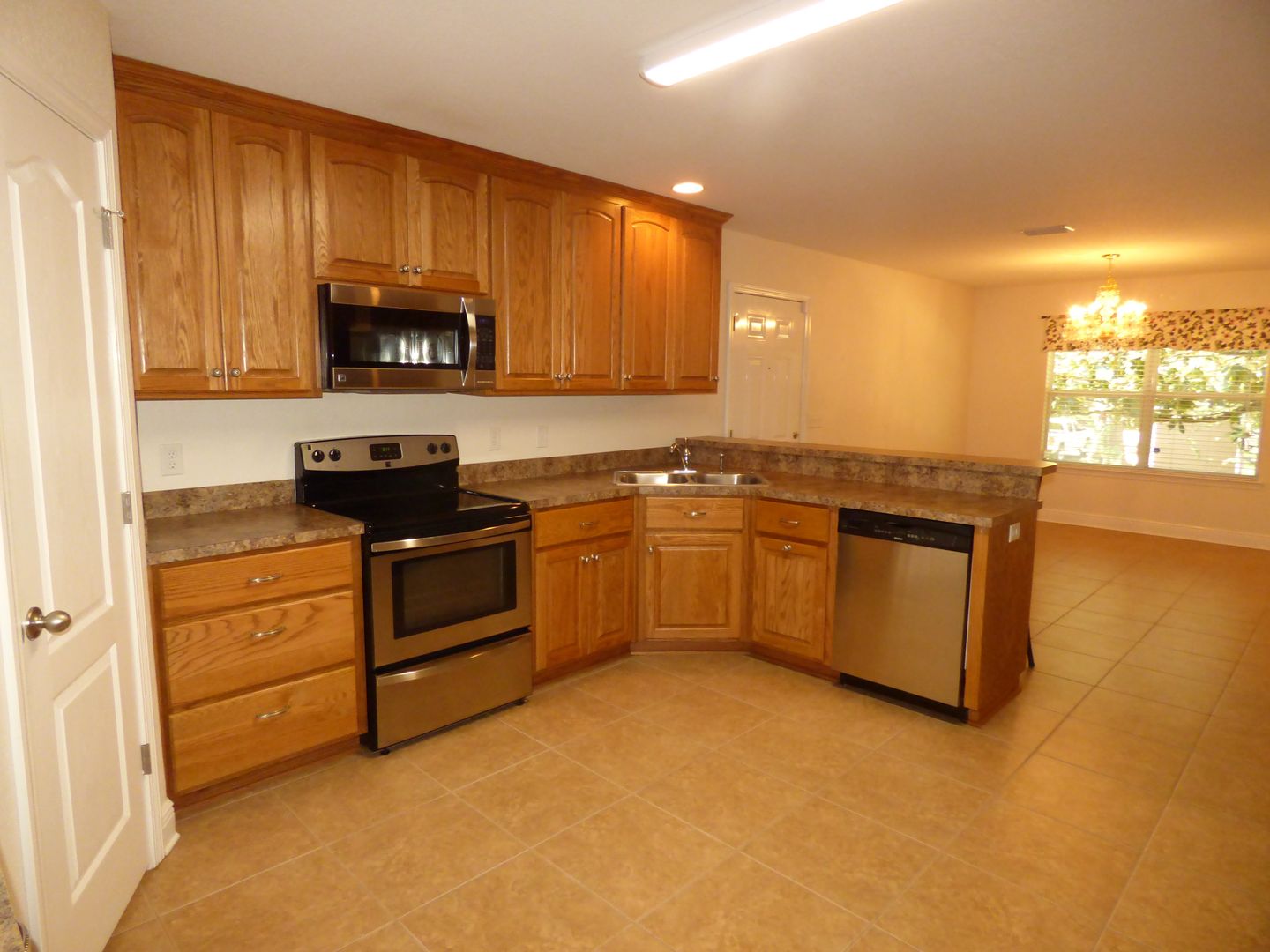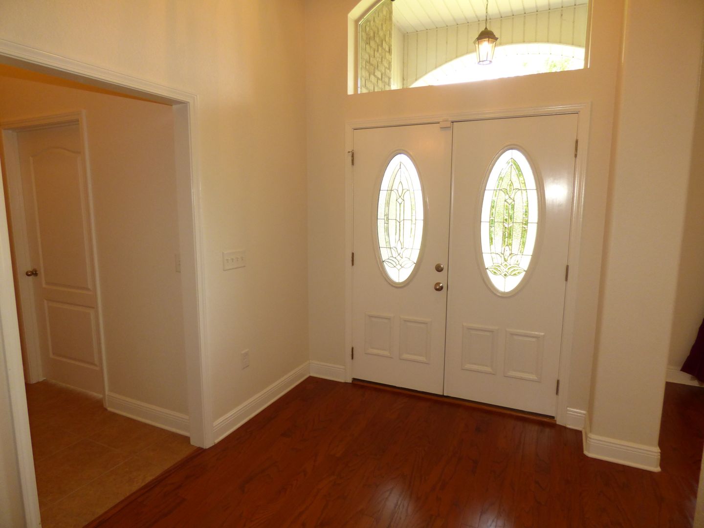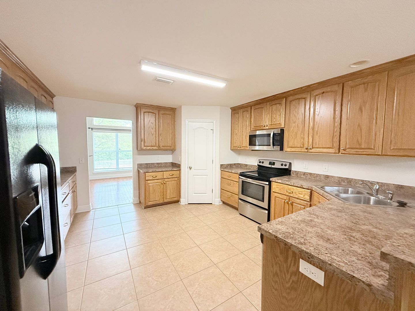 As you enter from the covered front porch, you're welcomed by a grand foyer with soaring ceilings, a formal dining room to the left, and a spacious living room straight ahead featuring a cozy fireplace. Rich wood flooring flows throughout the main living areas, leading into a well-appointed eat-in kitchen with tile flooring, abundant cabinet and counter space, and a convenient bar-top area. Appliances include a refrigerator, flat-top range/oven, built-in microwave, and a dishwasher.