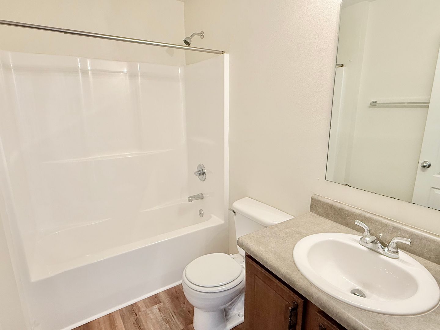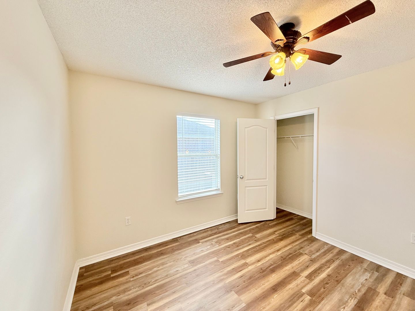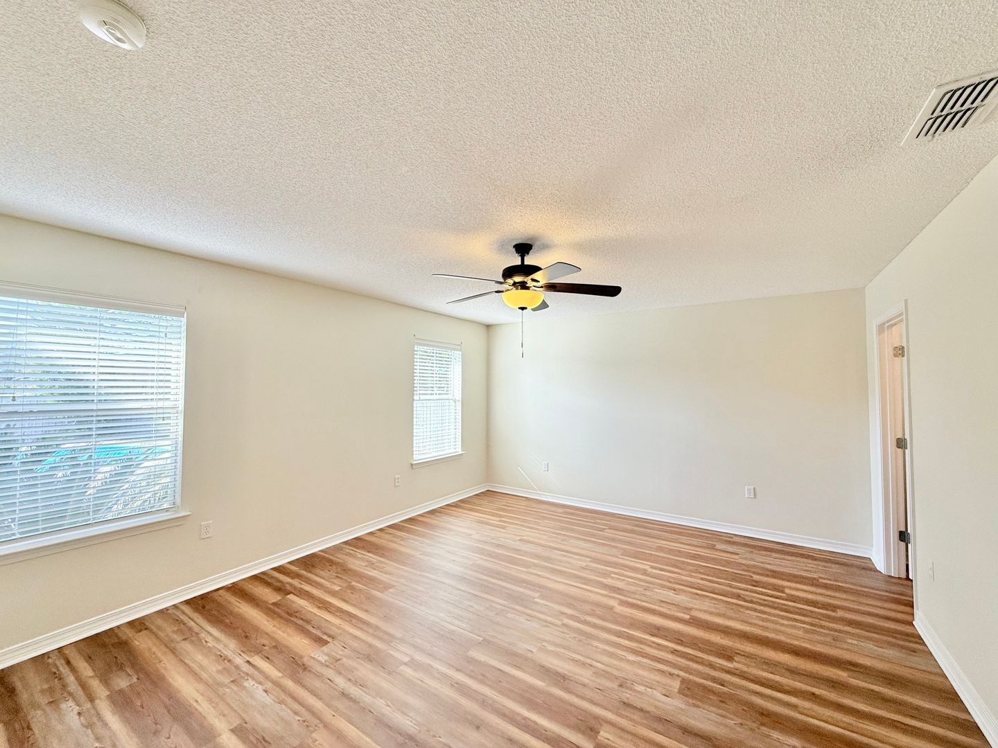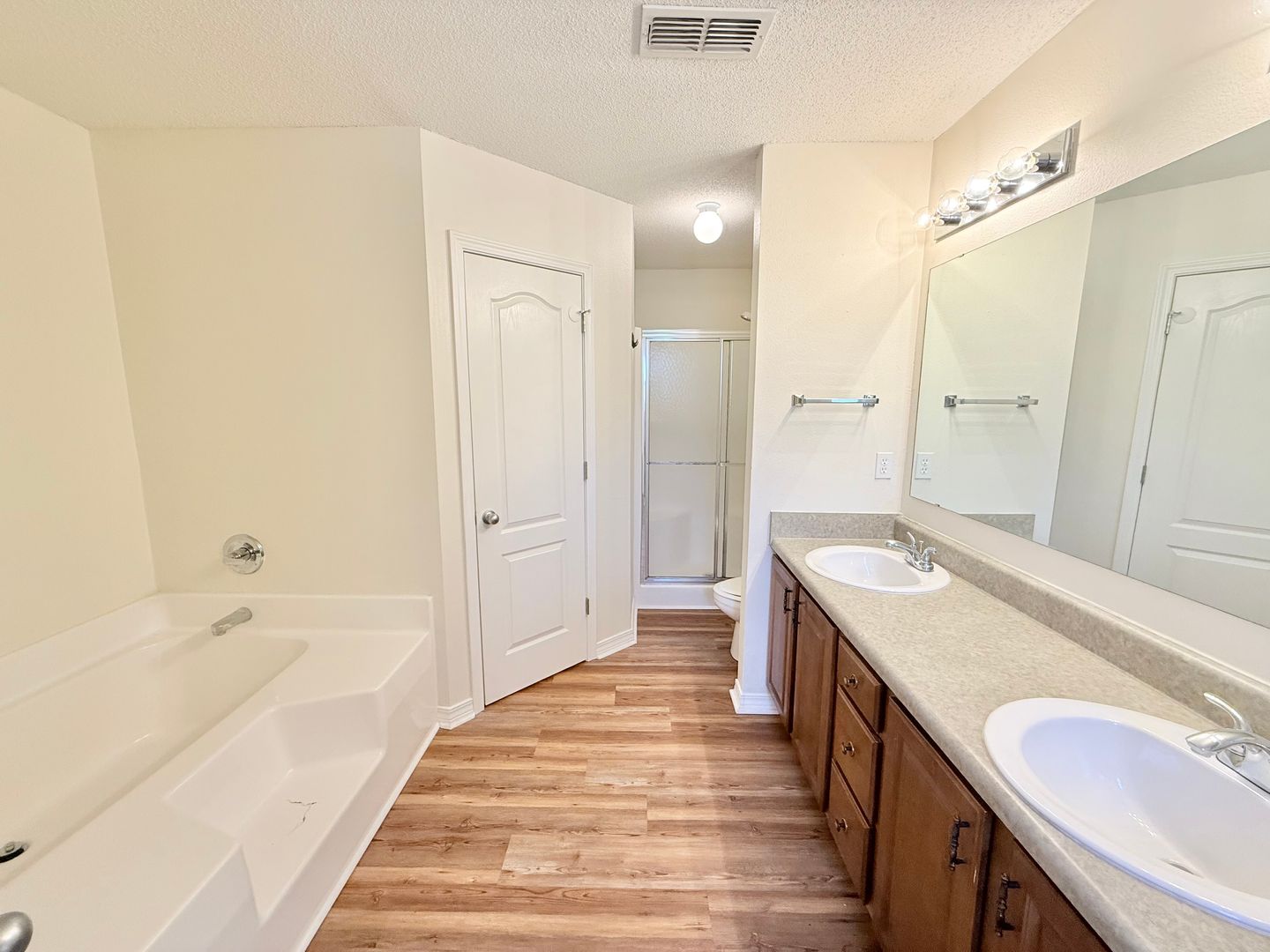 The primary suite offers a ceiling fan for added comfort, and an ensuite bathroom with dual vanities, standing shower, and separate garden tub. Two additional bedrooms share a second full bath with single vanity and tub/shower combo.