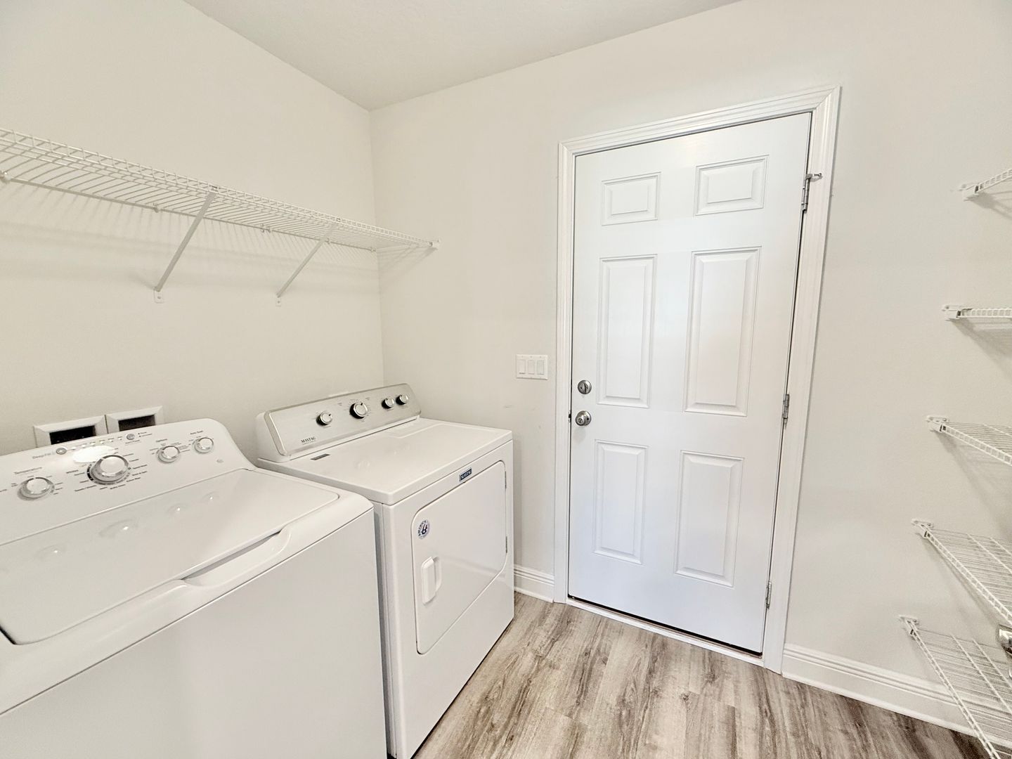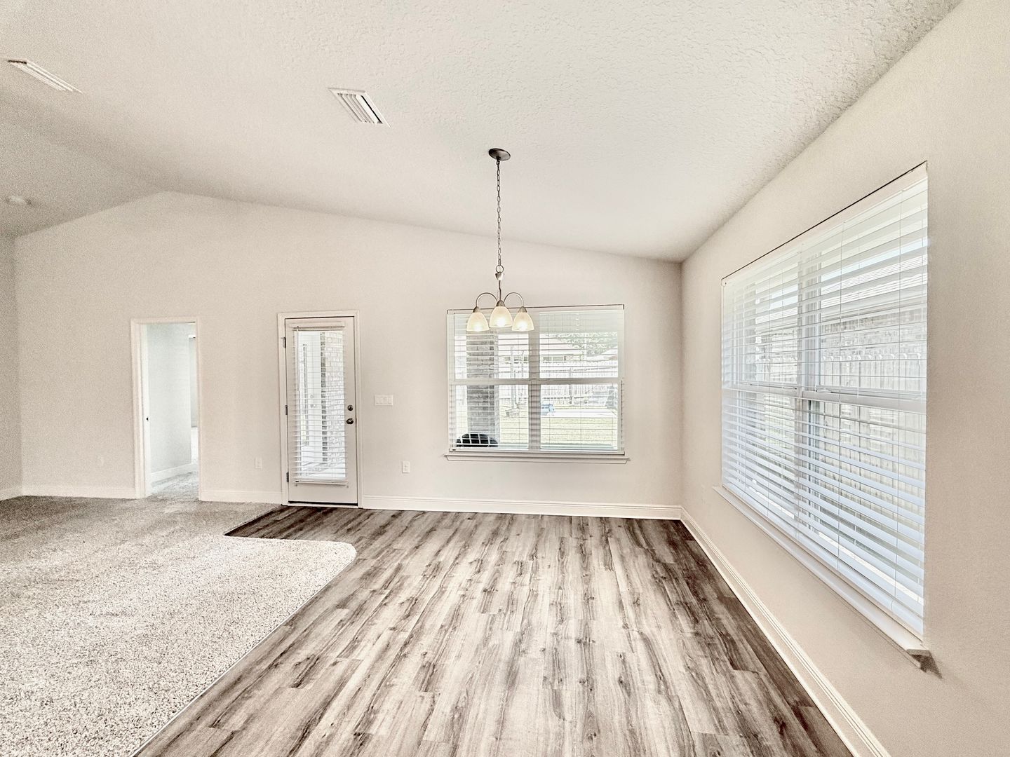 Inside, the stylish living room offers vaulted ceilings and an open, inviting atmosphere. Just off the living area, a generously-sized dining area is perfect for family gatherings or entertaining friends. The galley-style kitchen is a chef’s delight, featuring elegant cabinetry, granite countertops, luxury vinyl flooring, and a spacious eat-in area ideal for casual meals. Adjacent to the kitchen, the laundry room includes a full-size washer and dryer, plus an abundance of shelving for added storage.
