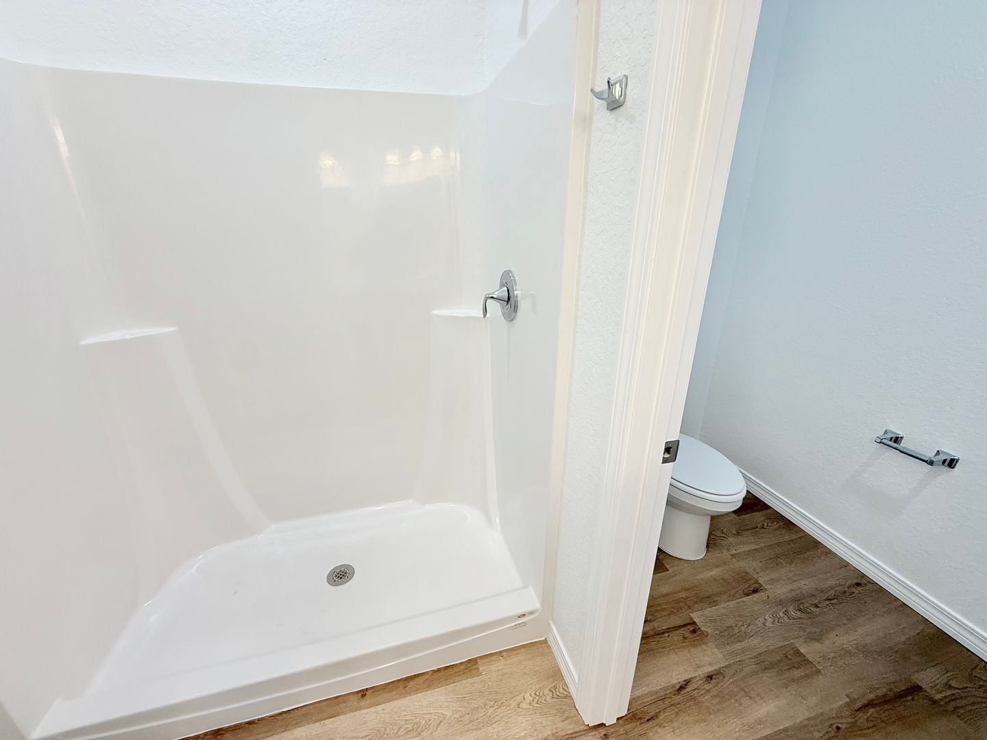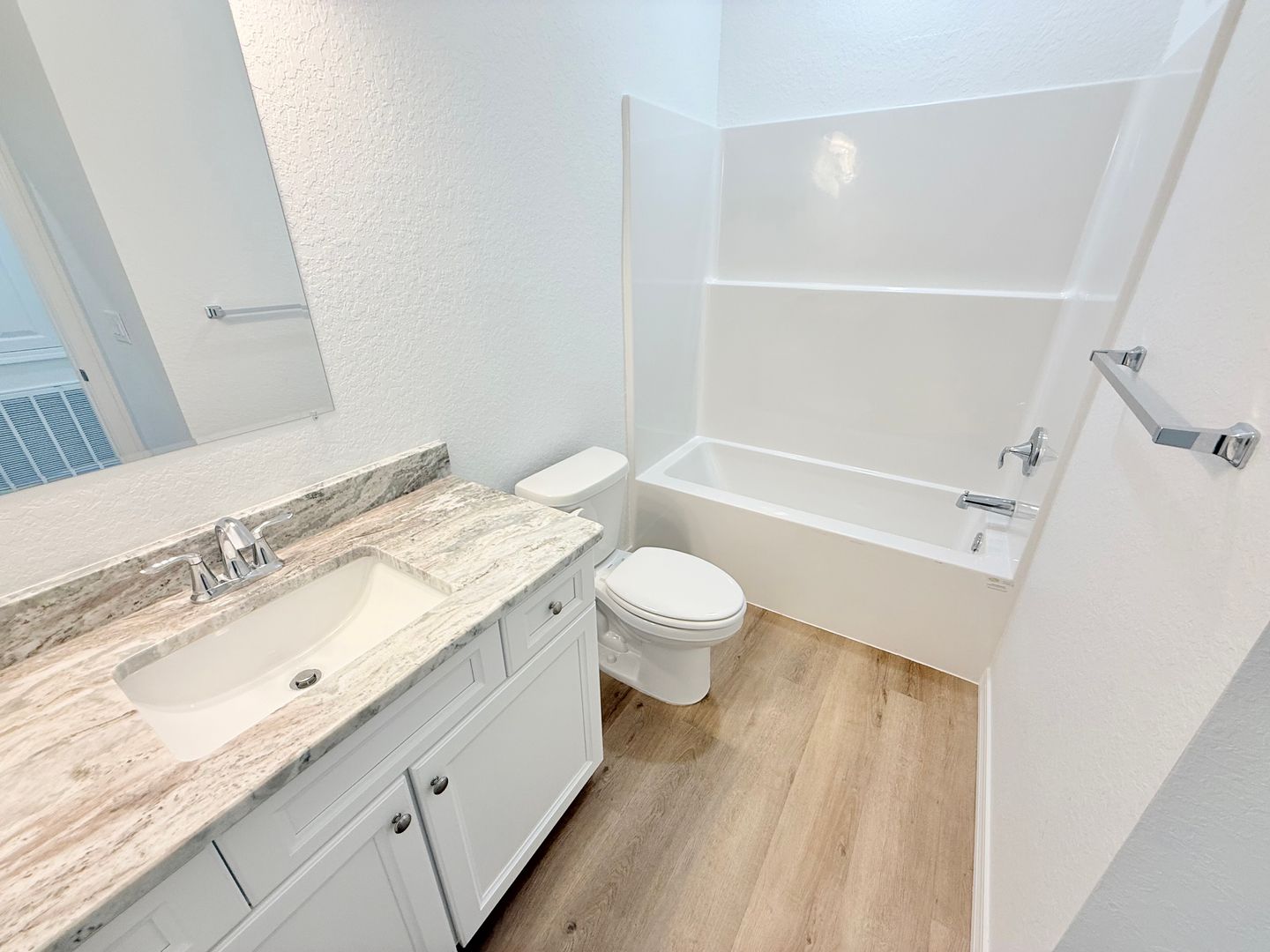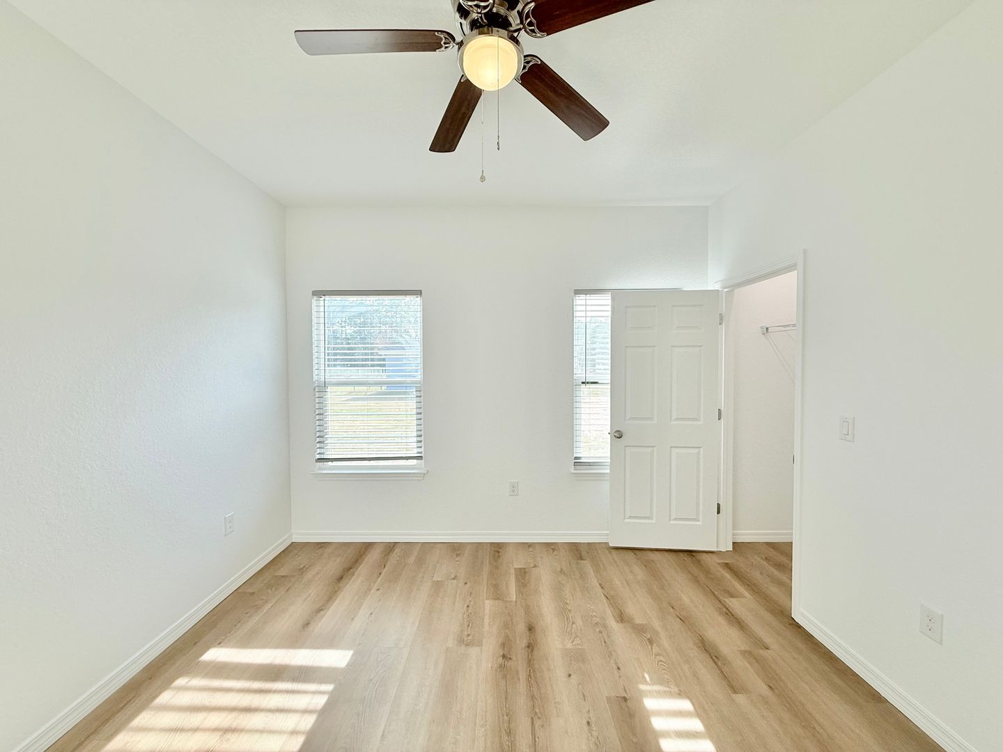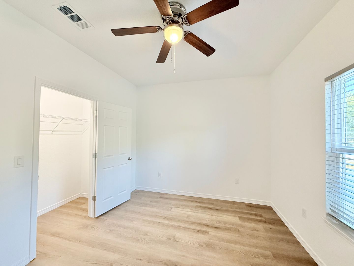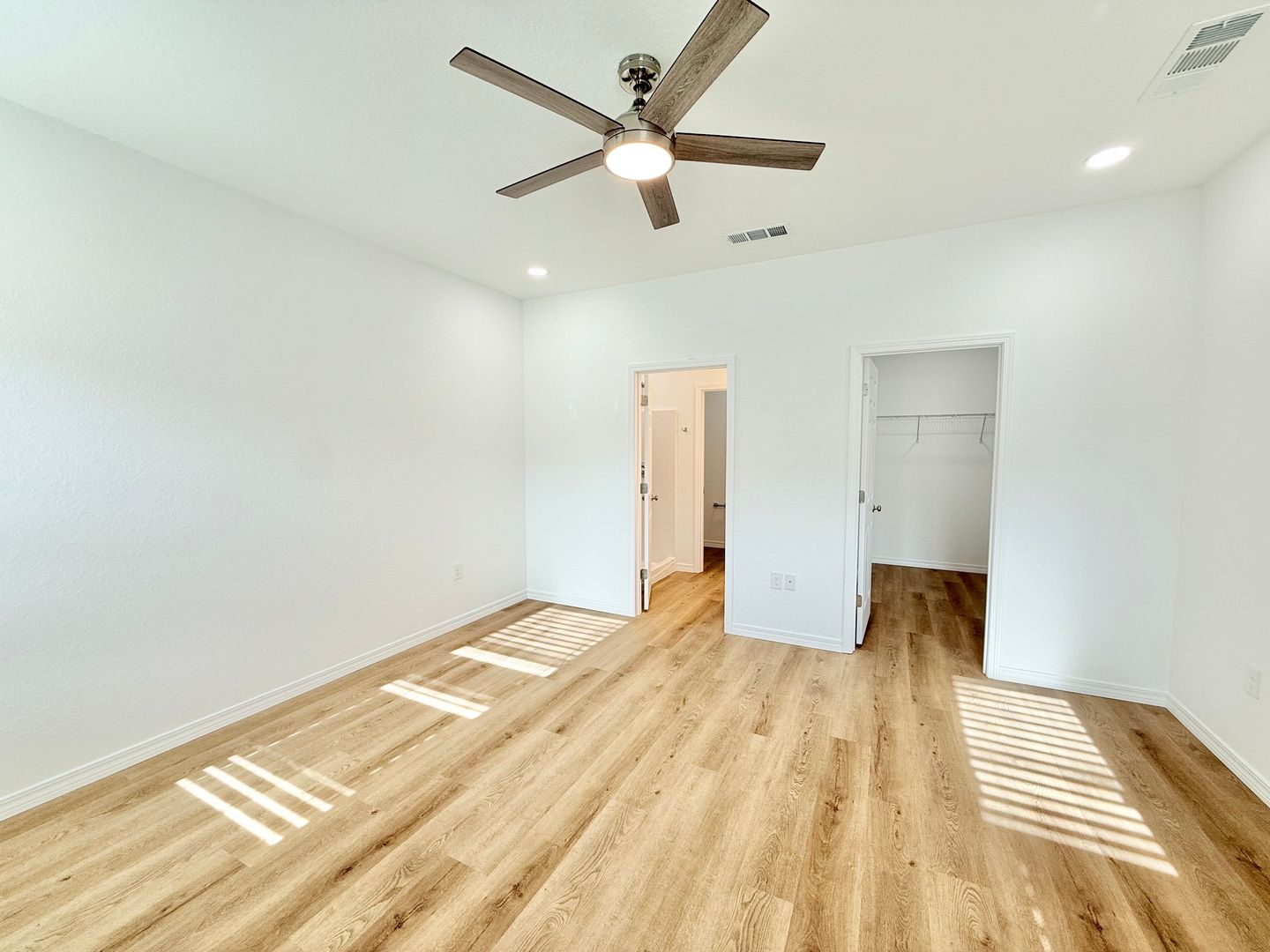 The master suite provides a peaceful retreat with a large walk-in closet and an ensuite bathroom featuring a private water closet, dual vanities, and a standing shower. Three additional bedrooms share a second full bath with a single vanity and a tub/shower combo.
