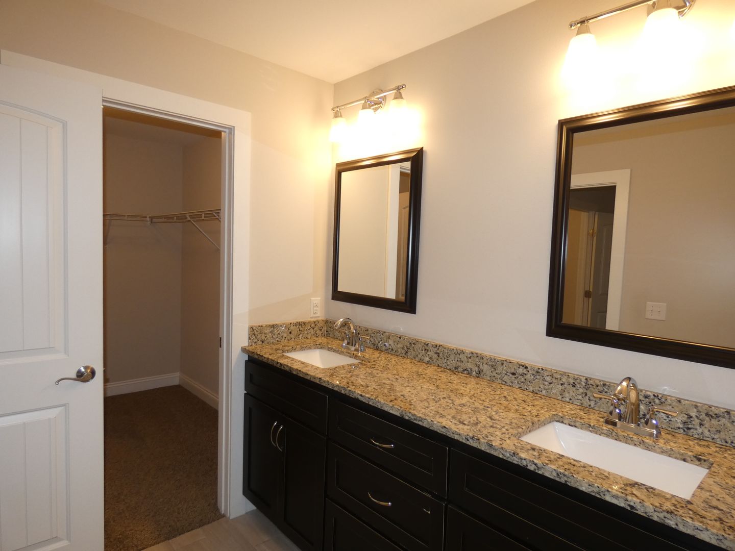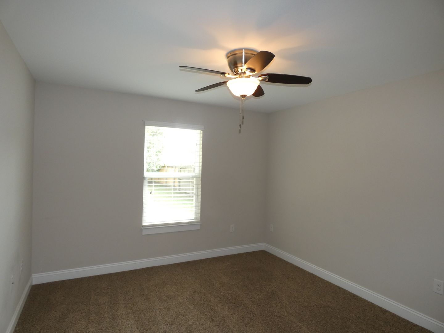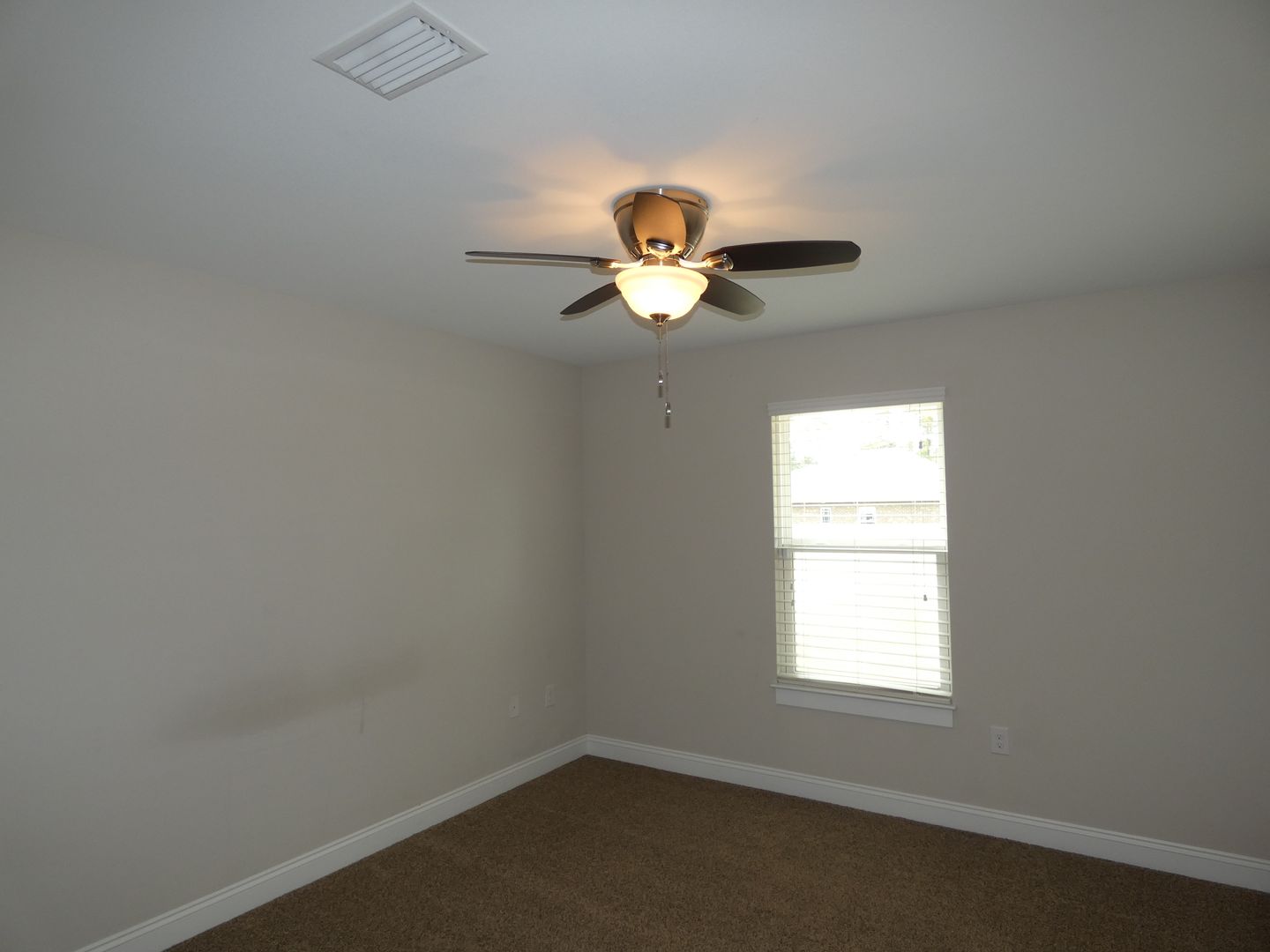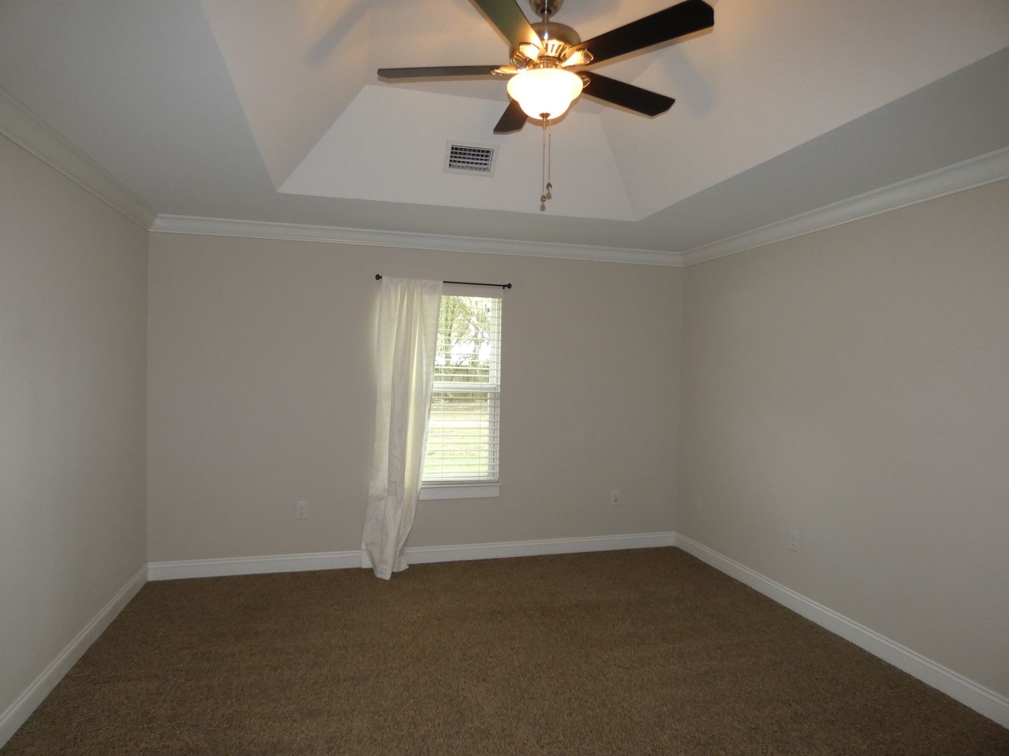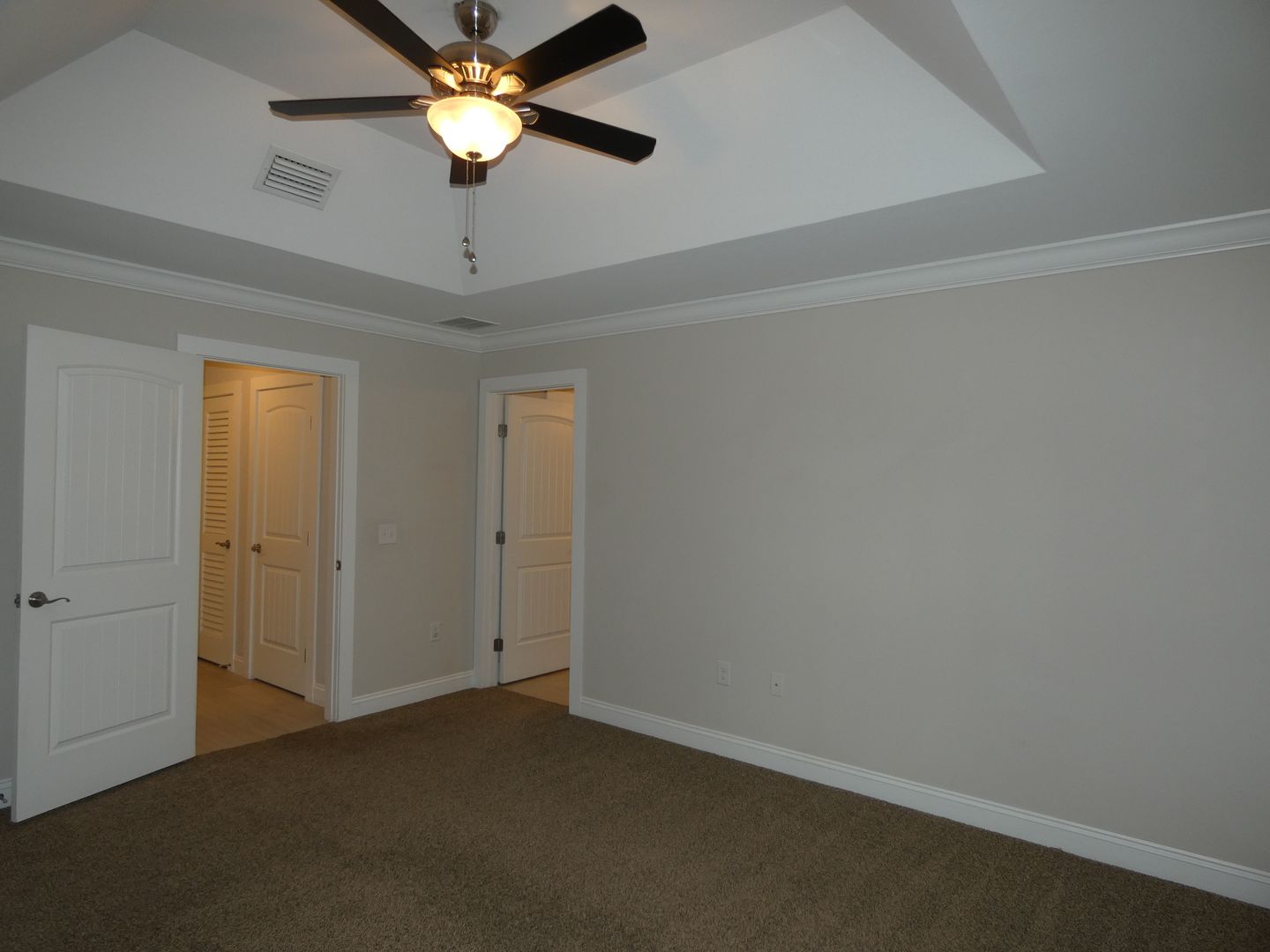The spacious bedrooms offer comfort with plush carpeting and ceiling fans. The primary suite boasts a beautiful tray ceiling and an ensuite bath with dual vanities, large framed mirrors, a large walk-in closet, and a huge walk-in shower with seating. The two additional bedrooms share a second full bath with single vanity and tub/shower combo.