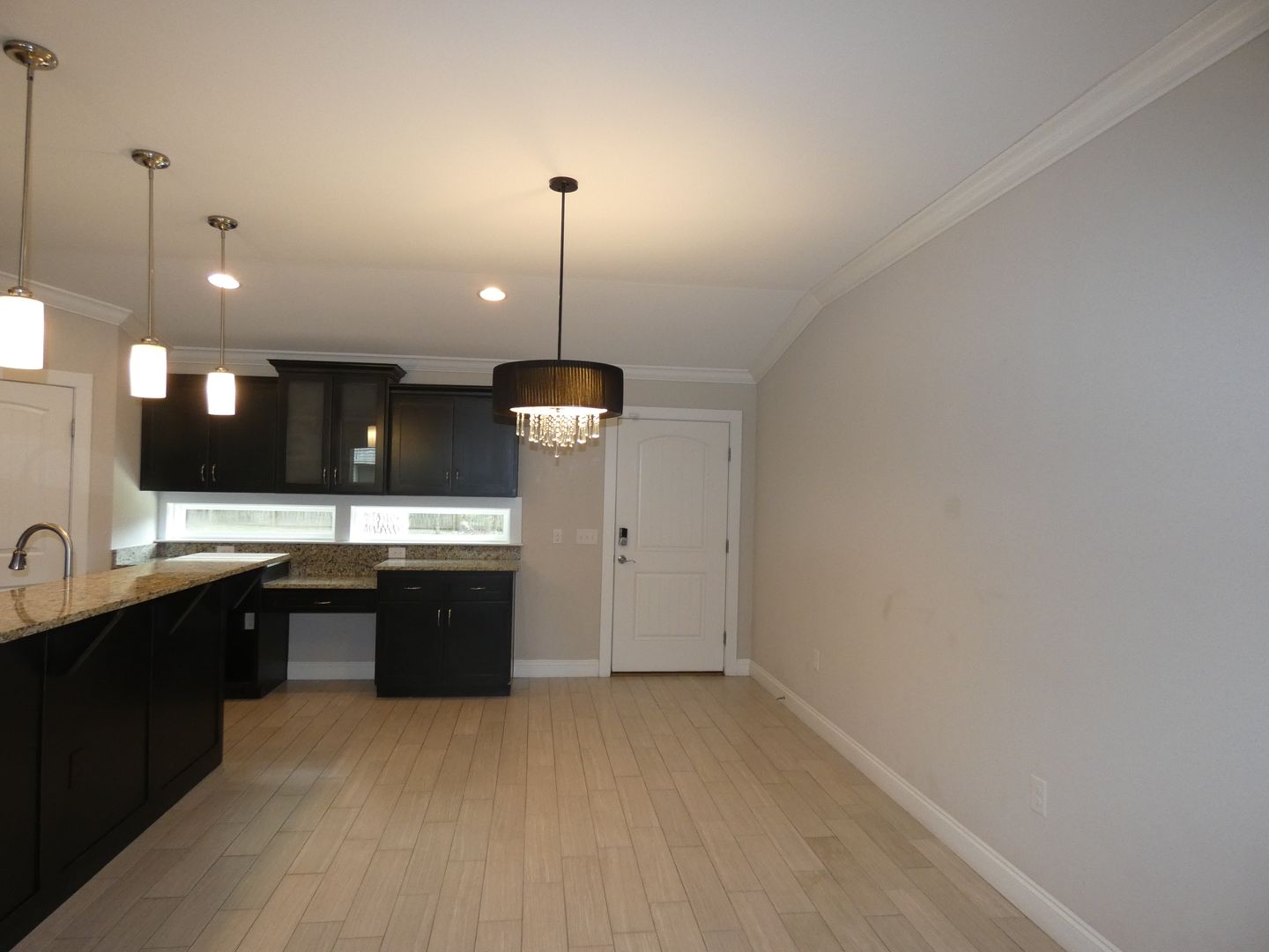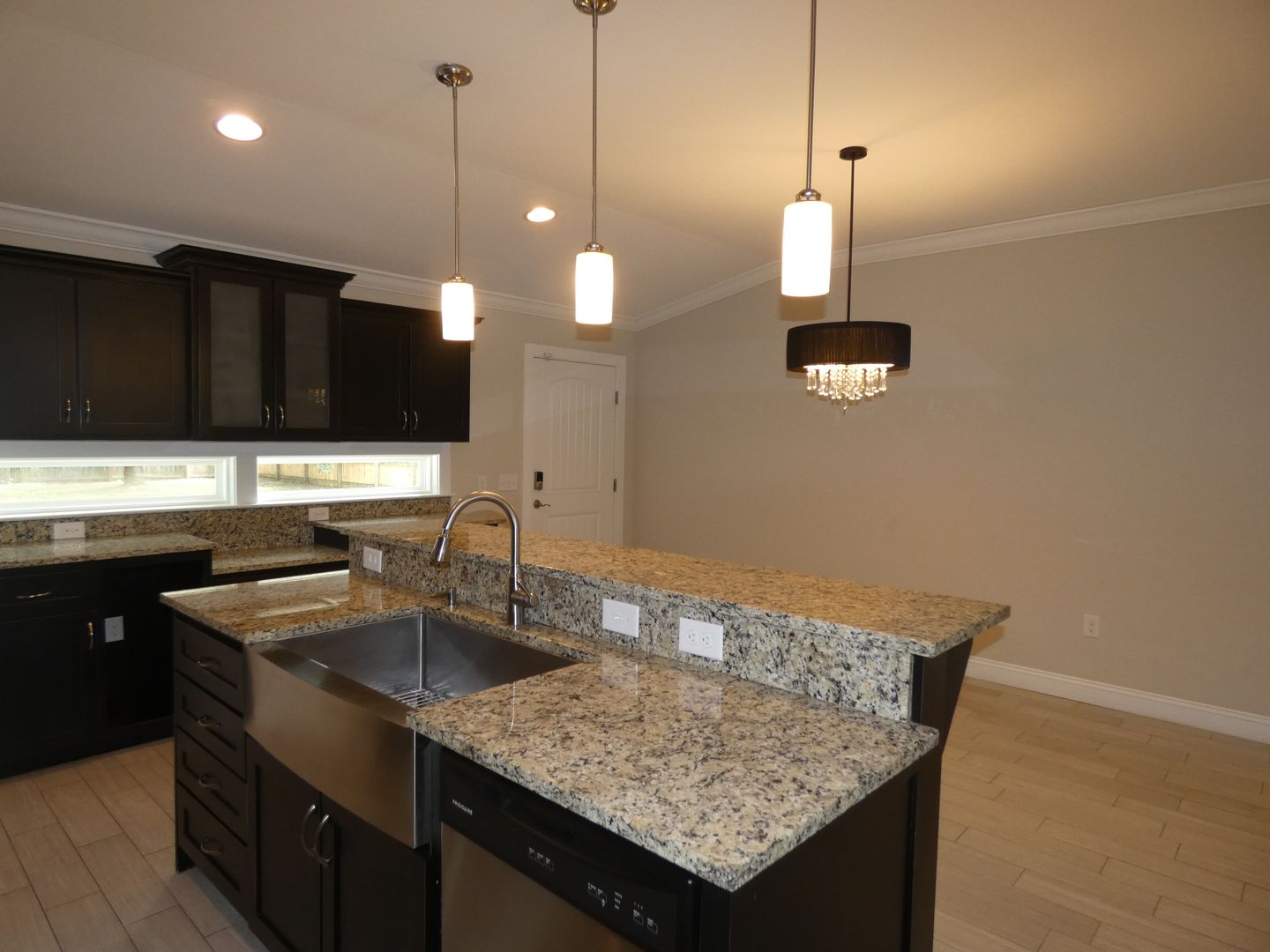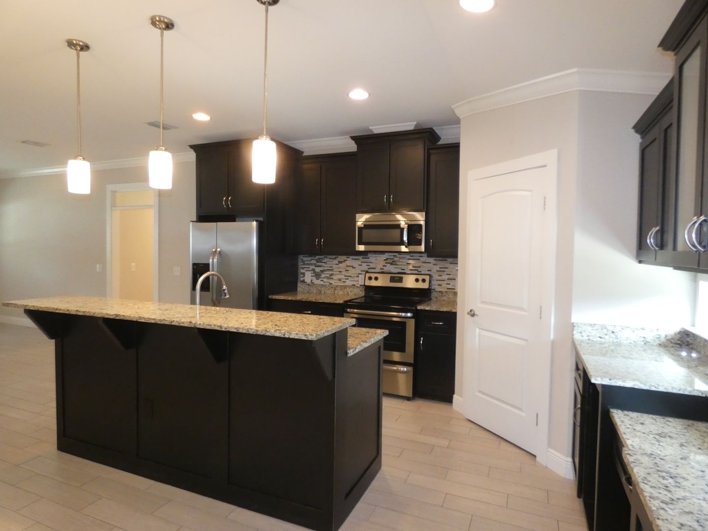 Enjoy the spacious, open-concept living area with wood-look tile flooring and a chef-inspired kitchen featuring granite countertops, tile backsplash, stylish pendant lighting, a large center island with stainless steel farmhouse sink, and a spacious pantry with built-in storage. Stainless steel appliances include a side-by-side refrigerator, flat top range/oven, built-in microwave, and dishwasher.