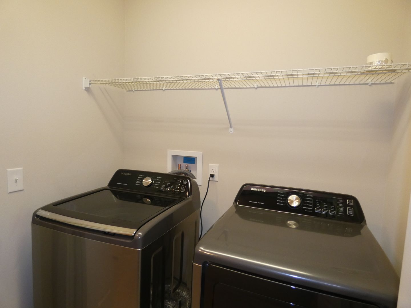 Additional highlights include a covered front porch, a large, fully-fenced backyard, two-car garage, and a dedicated laundry room with a full-size washer and dryer provided.