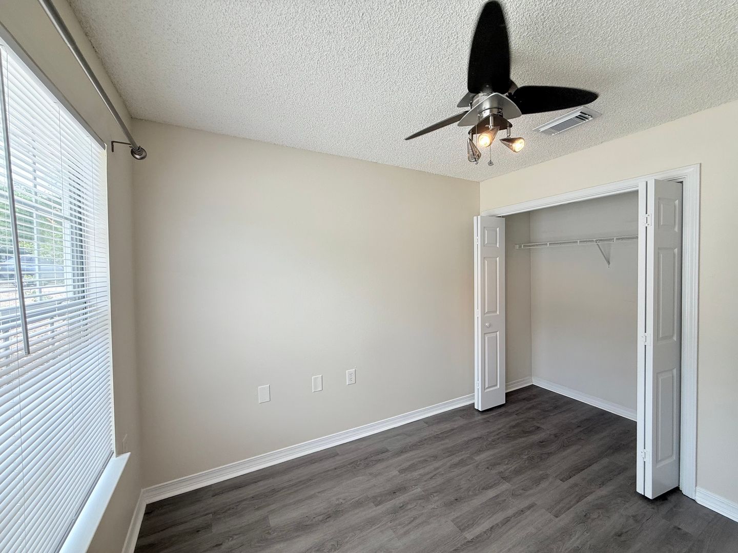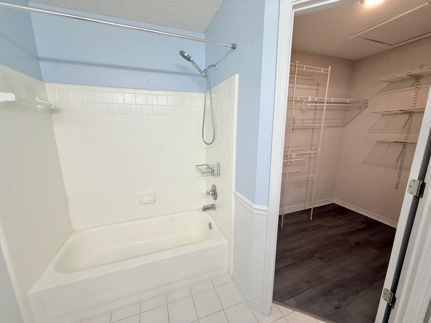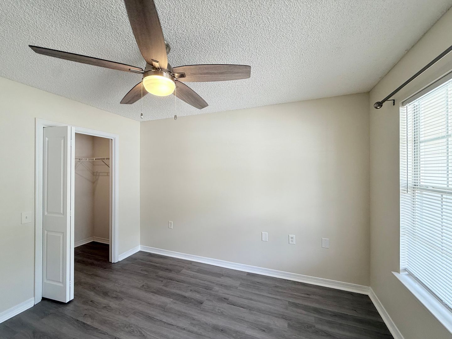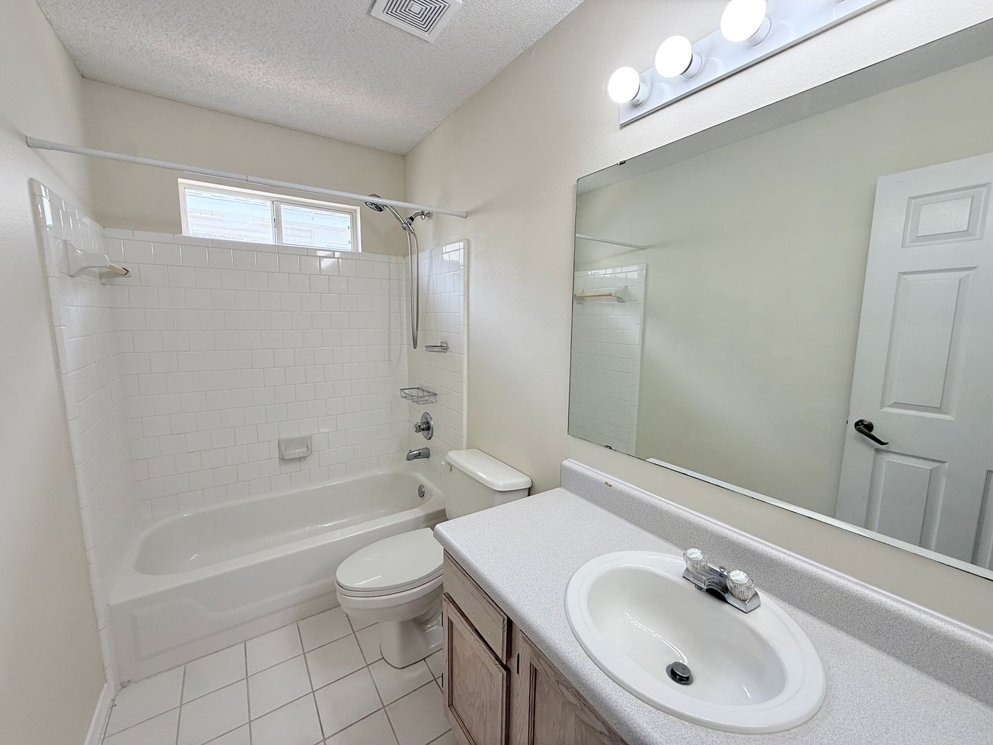 The primary bedroom features wood flooring, a ceiling fan, and an ensuite bathroom with a single vanity, private water closet, tub/shower combo, and a spacious walk-in closet. Two additional bedrooms share a second full bathroom with a single vanity and tub/shower combo.