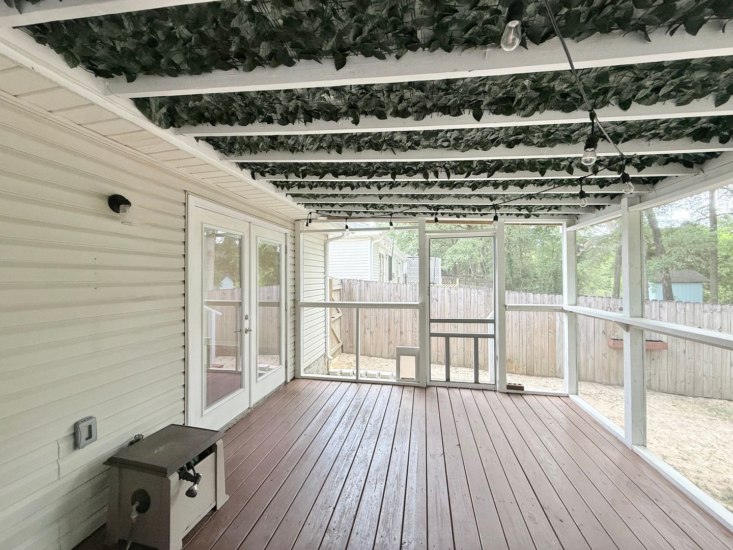 Additional highlights include a laundry room with storage shelving and a full-size washer and dryer provided, a screened-in back porch, and a fully fenced backyard with planter boxes and a small storage shed.