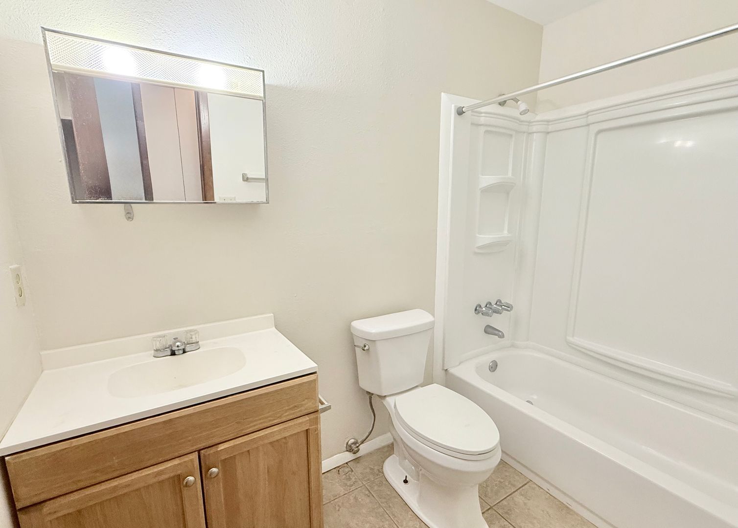 The galley-style kitchen offers a dual-basin sink overlooking the backyard, along with a standard refrigerator, flat-top range/oven, and dishwasher. The bathroom includes a single vanity and convenient tub/shower combo.