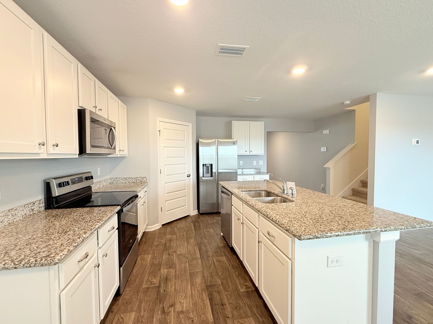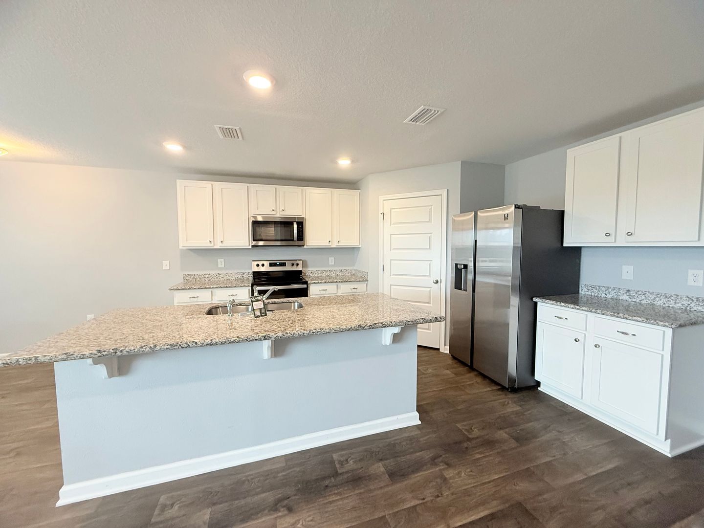 The large, open floor plan includes a bonus room downstairs and an additional loft area upstairs, providing plenty of flexible space for a home office, playroom, or entertainment area. The open-concept kitchen is a chef’s dream, including a dining area, large center island with bar seating, granite counter tops, pantry, undermount double-basin sink, and modern stainless steel appliances.