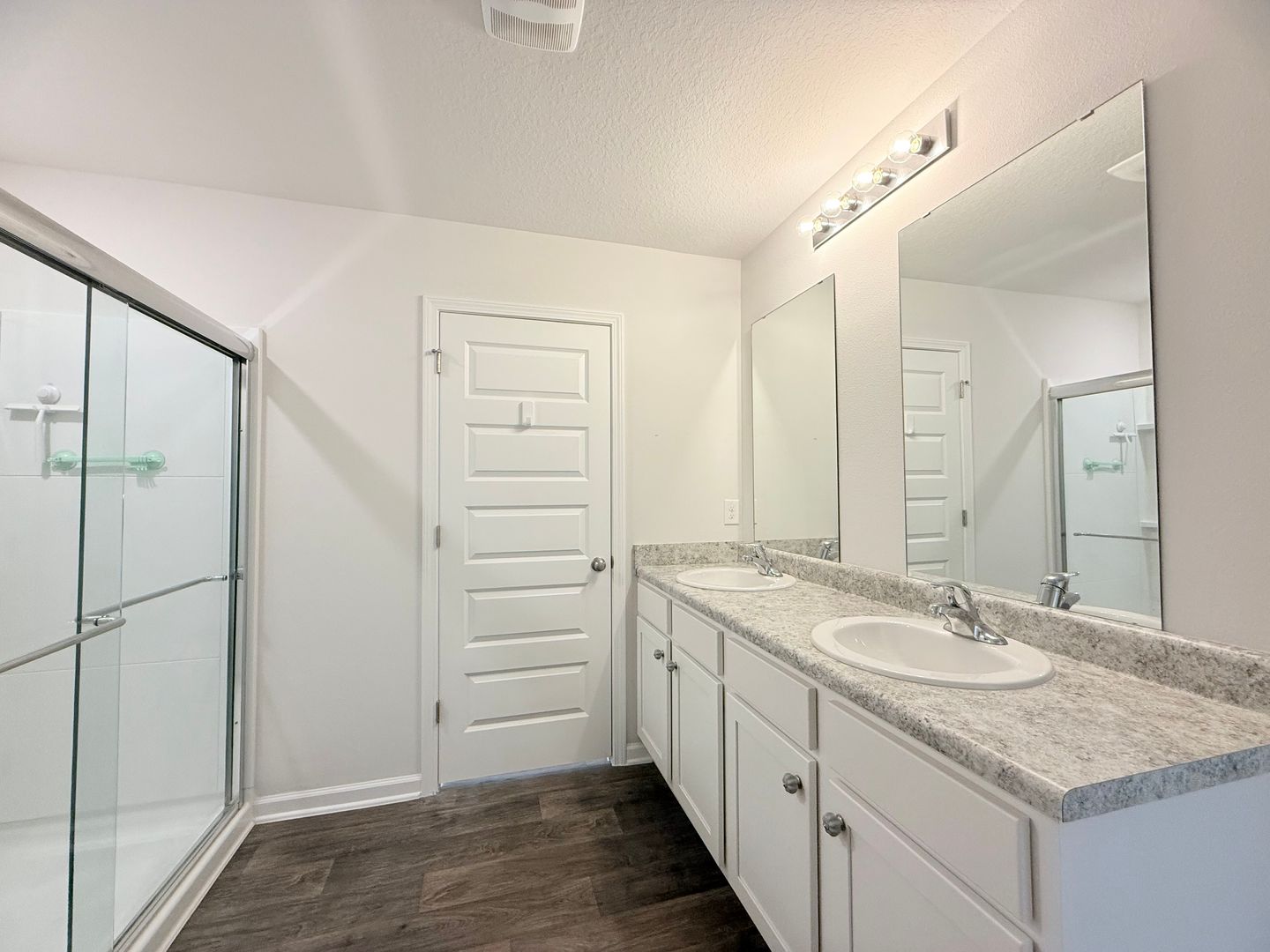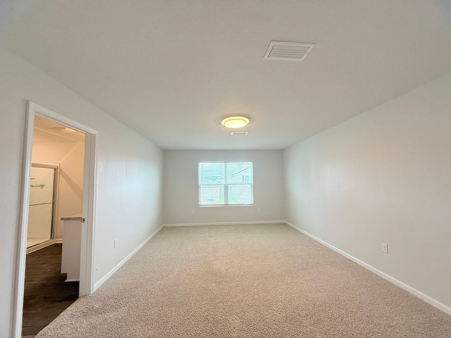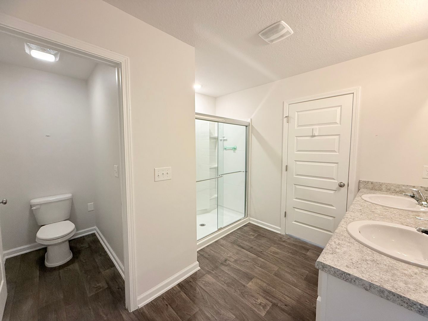 One guest bedroom and a full bath are located on the first floor, while the remaining four bedrooms and two bathrooms are upstairs. The generous primary suite boasts a massive walk-in closet and a luxurious en-suite bathroom with double vanity sinks and a large 5-foot walk-in shower.