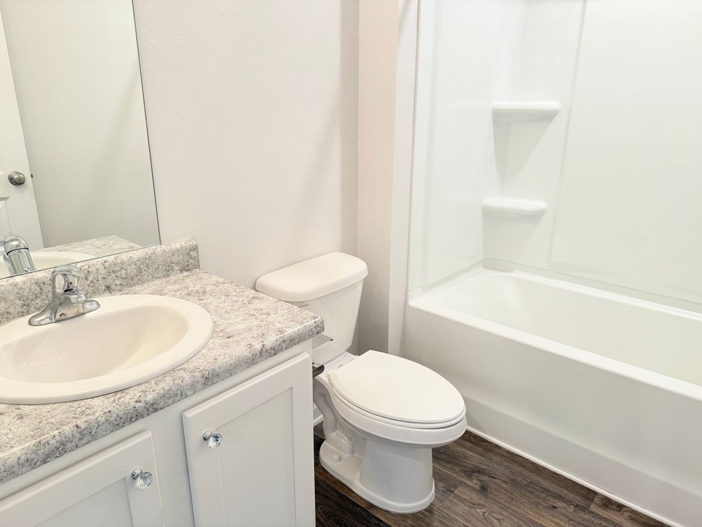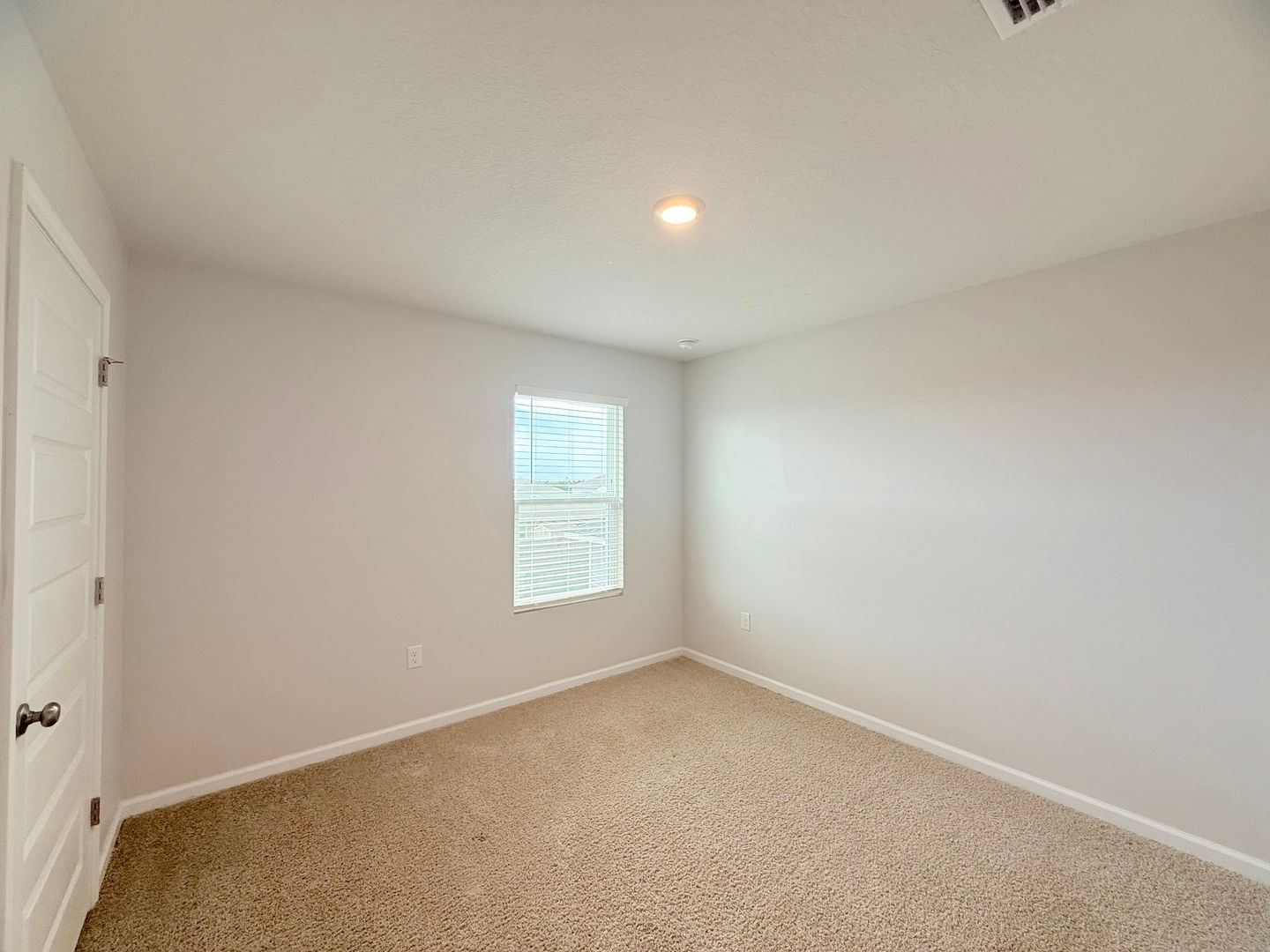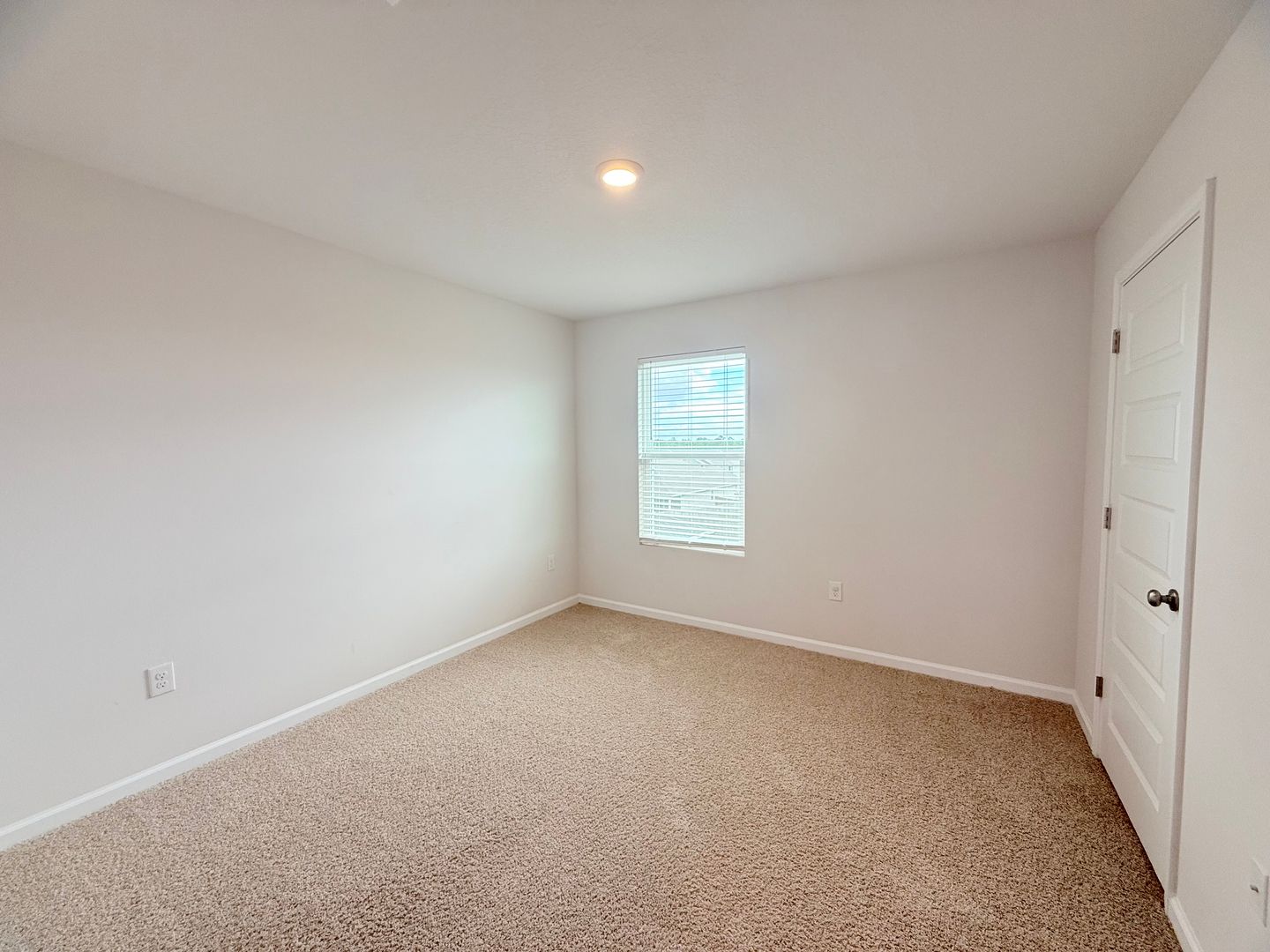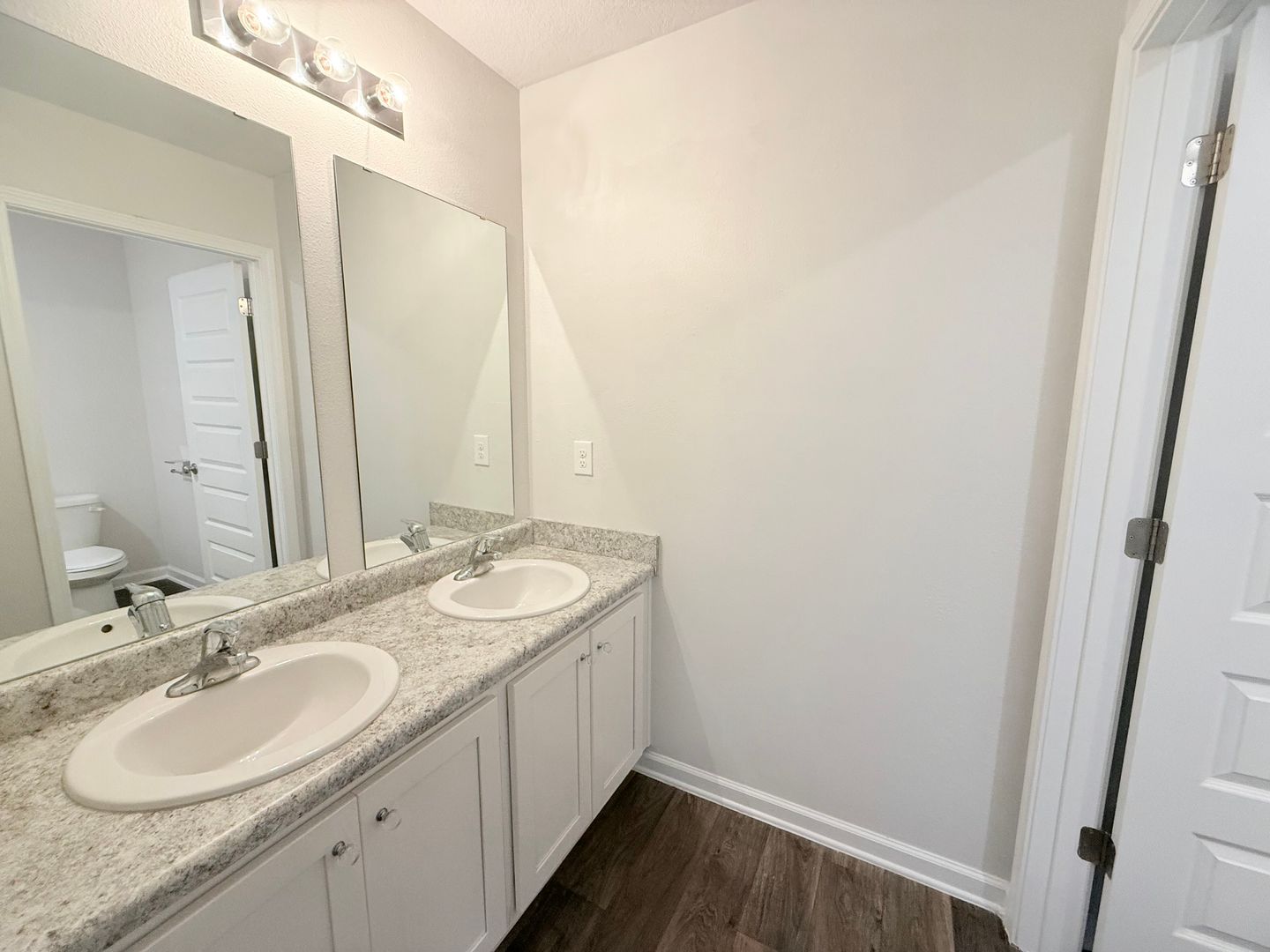 One guest bedroom and a full bath are located on the first floor, while the remaining four bedrooms and two bathrooms are upstairs. The generous primary suite boasts a massive walk-in closet and a luxurious en-suite bathroom with double vanity sinks and a large 5-foot walk-in shower.