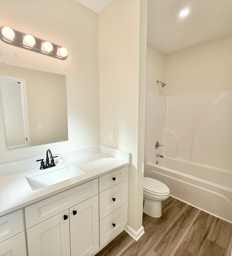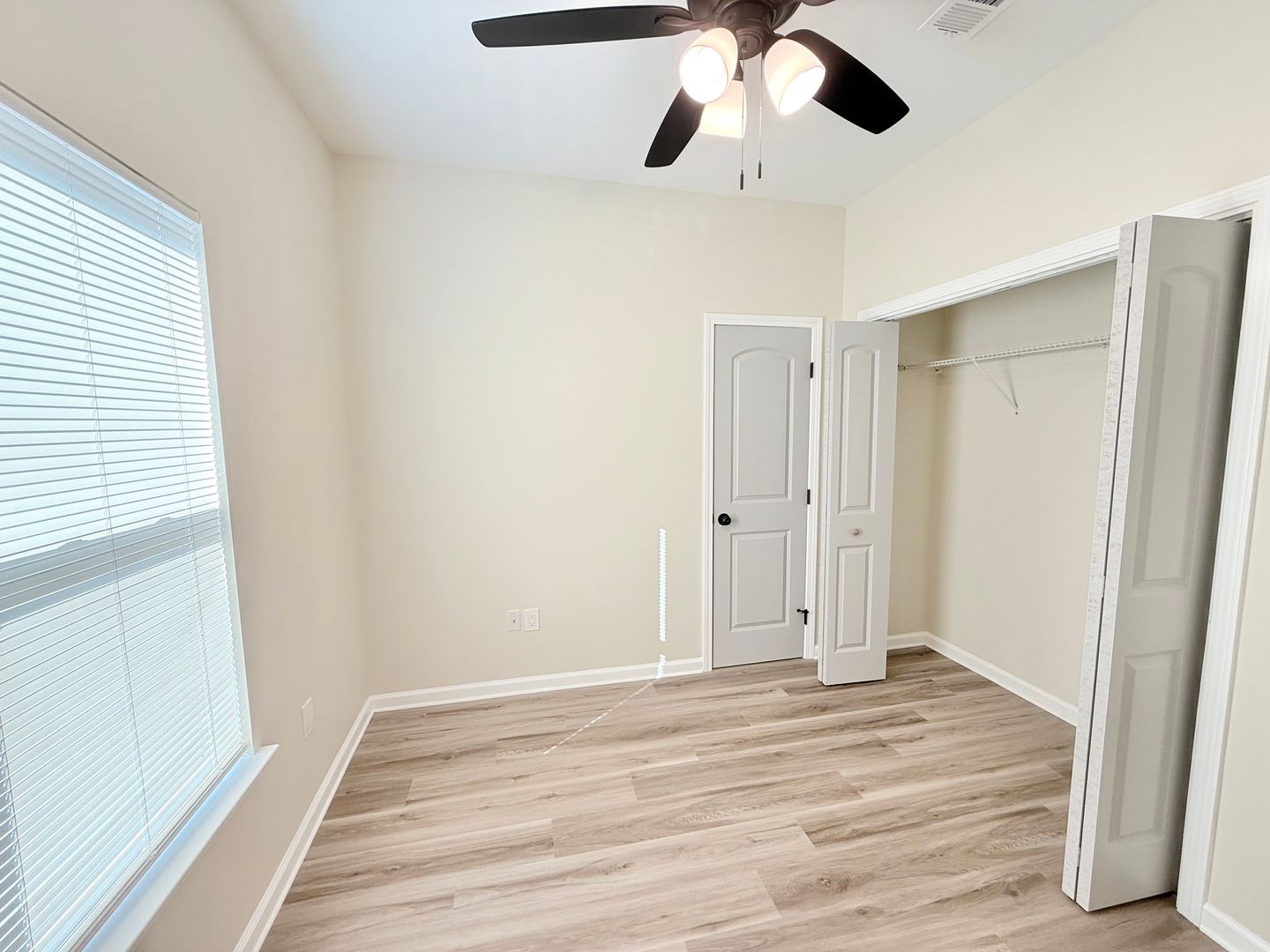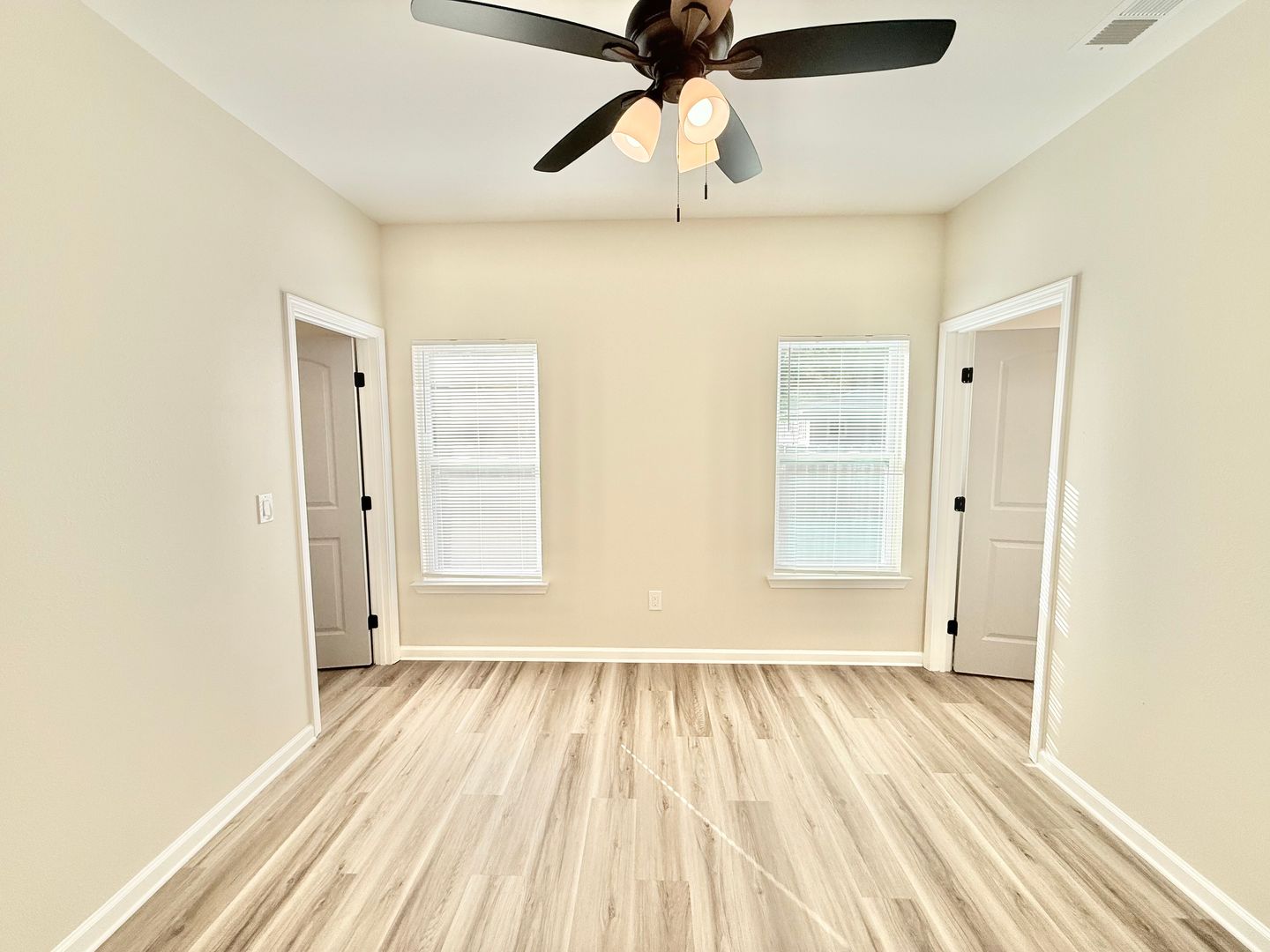 Both bedrooms include ceiling fans and closets for comfortable, convenient living. The primary bathroom features a single stone vanity with a tub/shower combo, while the second bathroom offers a single stone vanity and a walk-in shower.